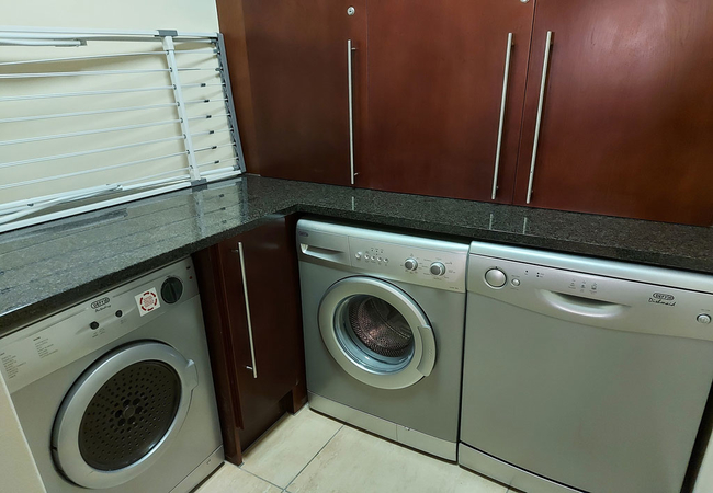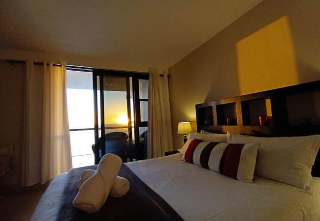 Ocean View 203A has two spacious bedrooms with Queen-size beds and large built in cupboards. The main en-suite has a luxurious corner bath with seat, as well as a shower and toilet. The main room has sliding doors with direct access to the balcony overlooking the sea. The second en-suite has a shower. This bedroom enjoys mountain views. The apartment has a separate guest toilet.