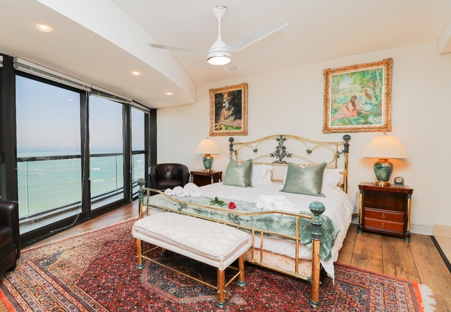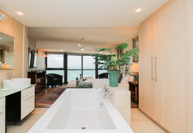 This 5th floor unit has three bedrooms and two bathrooms. The main bedroom is furnished with a Queen-size bed while the second bedroom has two single beds and the third bedroom has a double bed. All rooms have stunning sea and mountain views.