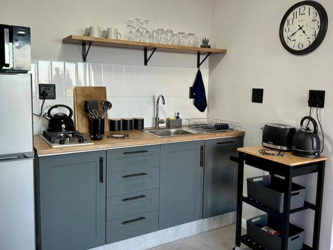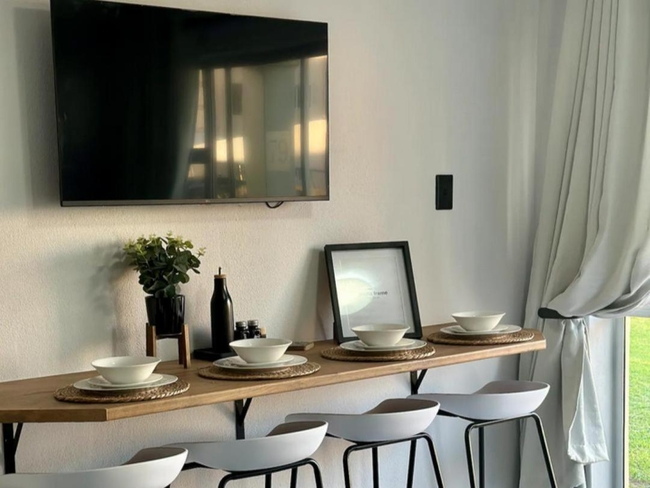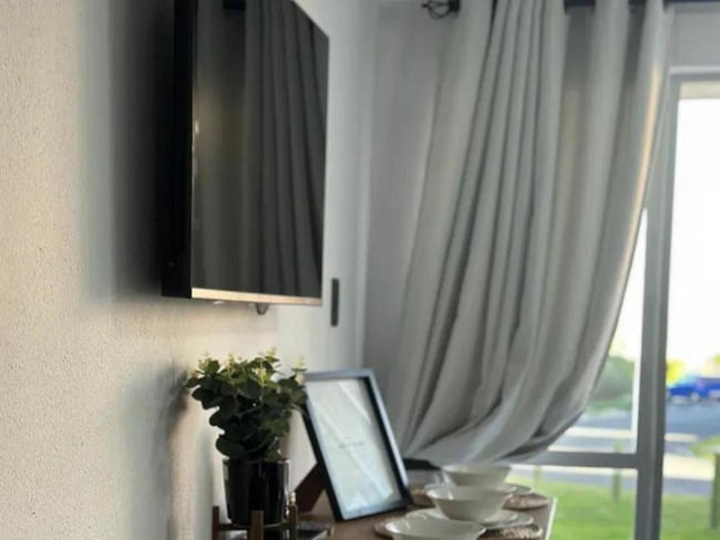 The cozy living room includes a TV, while the fully equipped kitchen boasts a microwave, toaster, stove-top, refrigerator, and kitchenware. Additionally, the apartment features an outdoor dining area and a barbecue for enjoying meals al fresco.