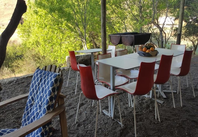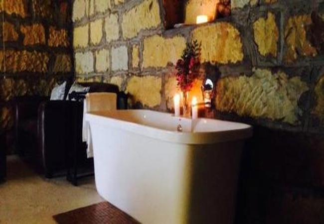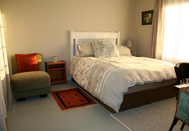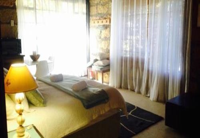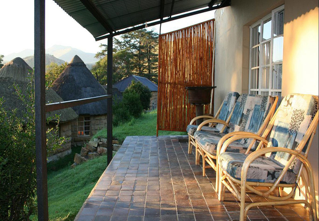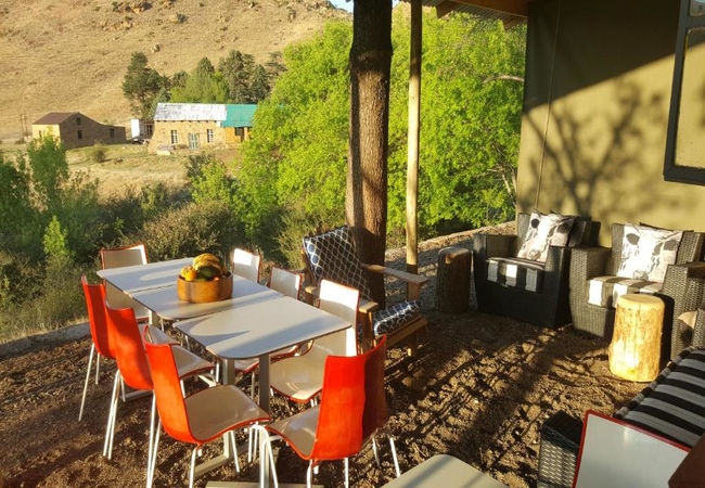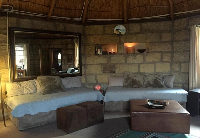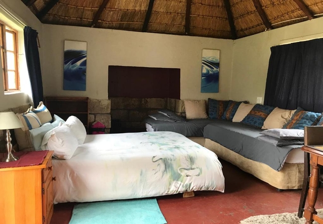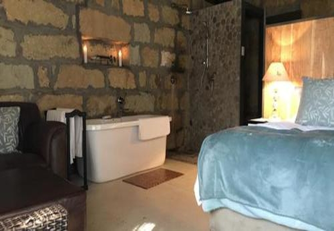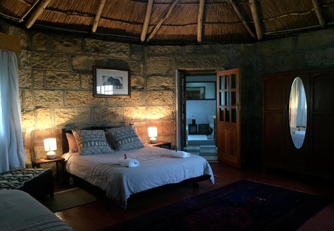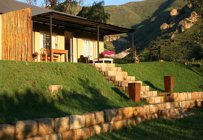 The Rock Chalet is a luxury suite furnished with an extra-length king size bed. His and hers shower and bath tub for two. Spectacular views with an outdoor braai area and a verandah from which to gaze across the paddocks over the Caledon river across to the Maluti / Drakensburg mountains.