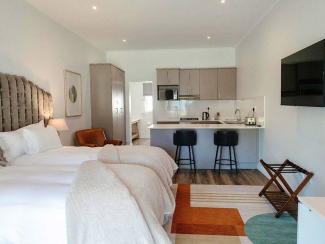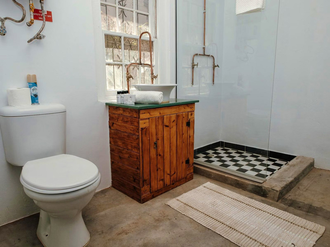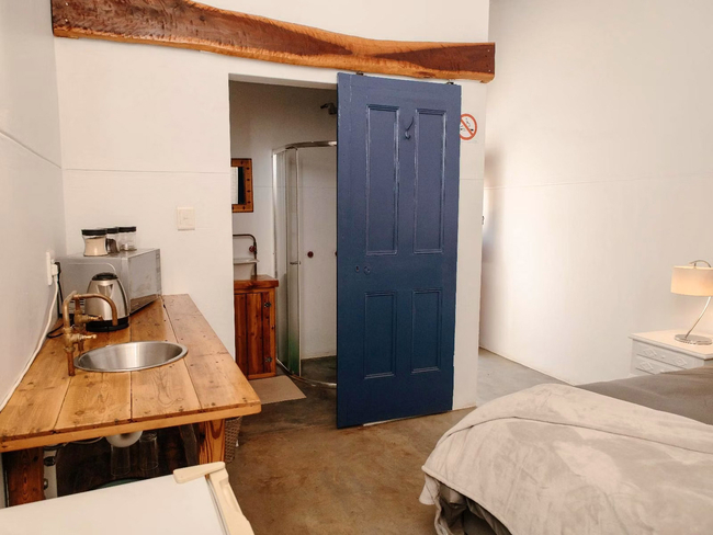 Volstruis Paleis offers a charming self-catering double room located in a separate building from the Manor House, overlooking the pool. The unit features a fully equipped kitchen complete with a refrigerator, microwave, oven, toaster, and all essential utensils, allowing guests to enjoy the comfort of home-cooked meals. The ensuite bathroom includes a shower, complimentary amenities, and a hairdryer. The room also offers a work desk, safe, and television with DStv, along with free Wi-Fi and coffee and tea facilities. Guests can unwind on the private patio and enjoy the peaceful surroundings. For added comfort, the room is non-smoking and equipped with hypoallergenic pillows.