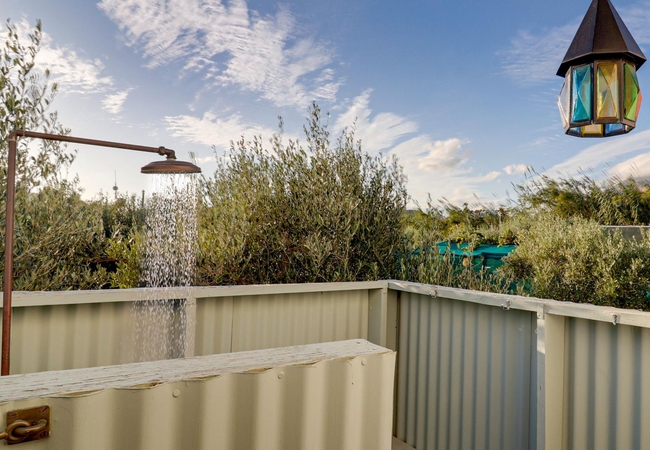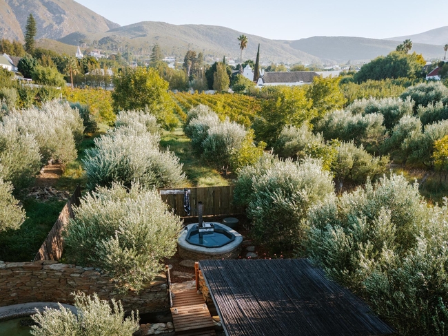 Olive Cottage can accommodate up to 2 guests and is furnished with a Queen-size bed. The bathroom is fitted with a shower, toilet and basin and there is also a hot outdoor shower. Inside the cottage is spacious with a fireplace, small lounge and dining area. The kitchen is equipped with a gas oven and stove to allow the cottage to be as off-grid as much as possible (no microwave). The cottage is very private with its own dip pool, and a braai surrounded by a stone wall. There is also a Kolkol hot tub available for guests.
