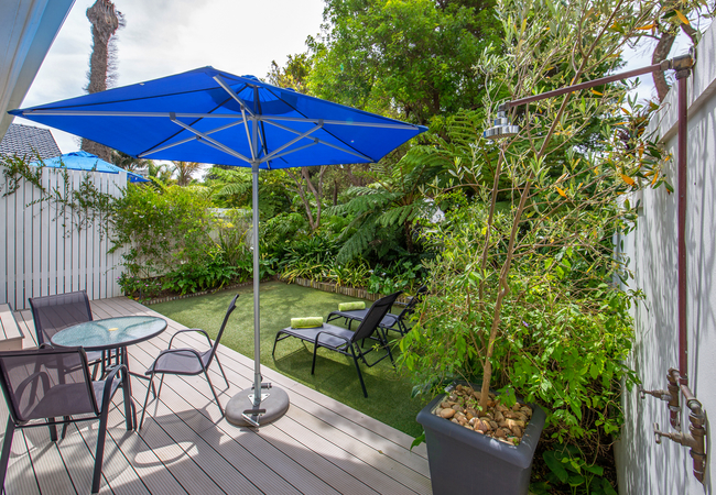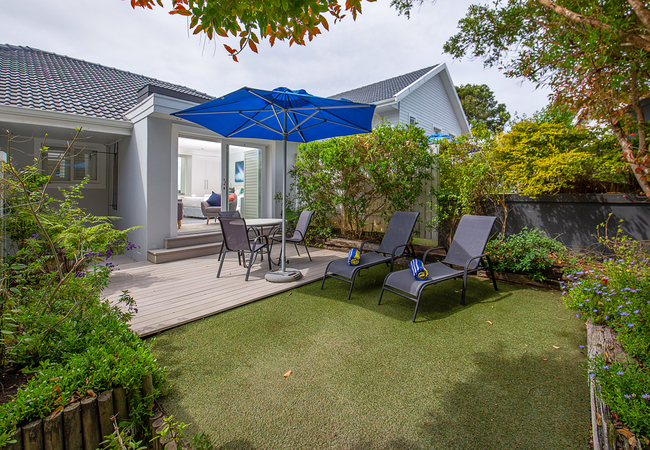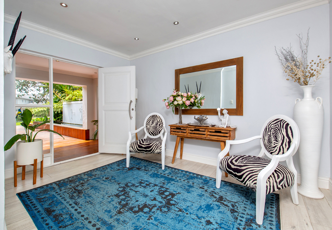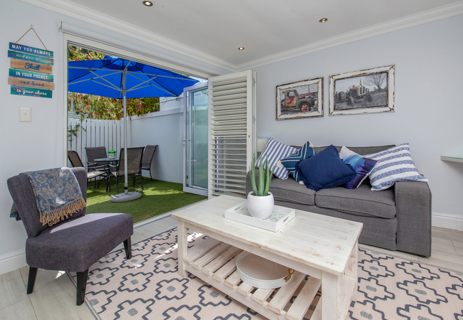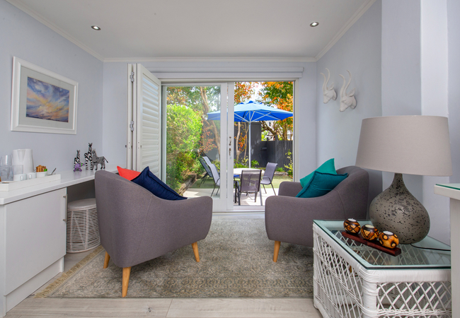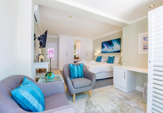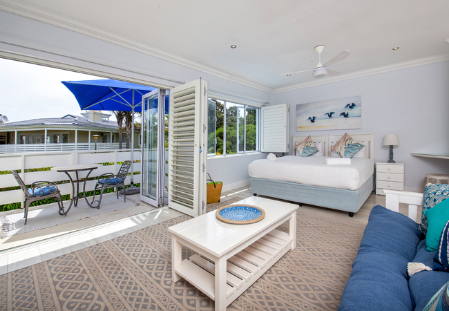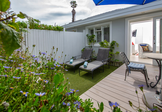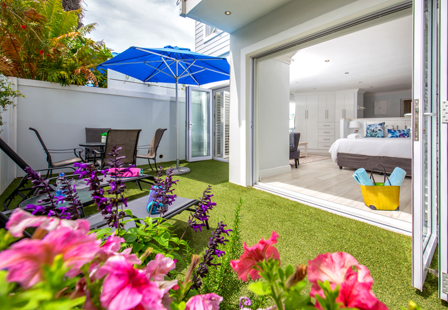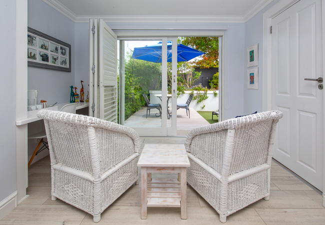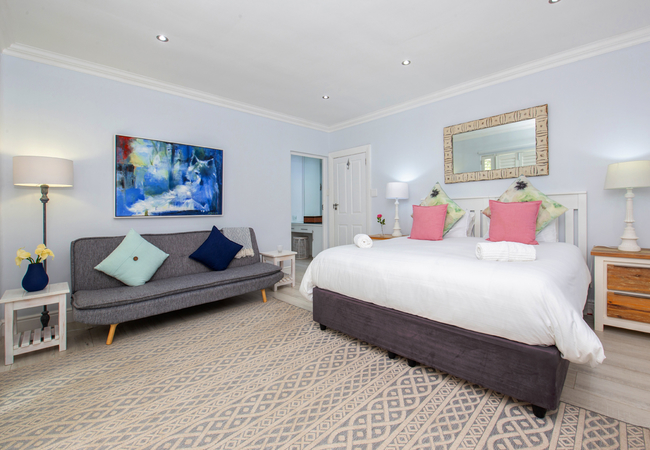 Mojo Suite is furnished with an extra length king-size bed and has a private entrance and garden. A double sleeper couch is in the suite, if required. The room is equipped with tea- and coffee-making facilities, air-conditioning with hot and cold settings, a work area with a USB port, Wi-Fi, a bar fridge, a digital safe, beach towels and a beach basket, a beach umbrella, cupboards for clothing and baggage storage, a dressing table with a mirror and hairdryer, and a TV with selected DSTV channels and Netflix. The bathroom has a bath, shower, double basin and heated towel rail. Their is a grassed area and a deck in the private garden with a table and chairs, umbrella and a pair of loungers. An outside shower with hot and cold water is on the deck to rinse off after visits to the beach. Designated parking for this suite is directly in front of the it.