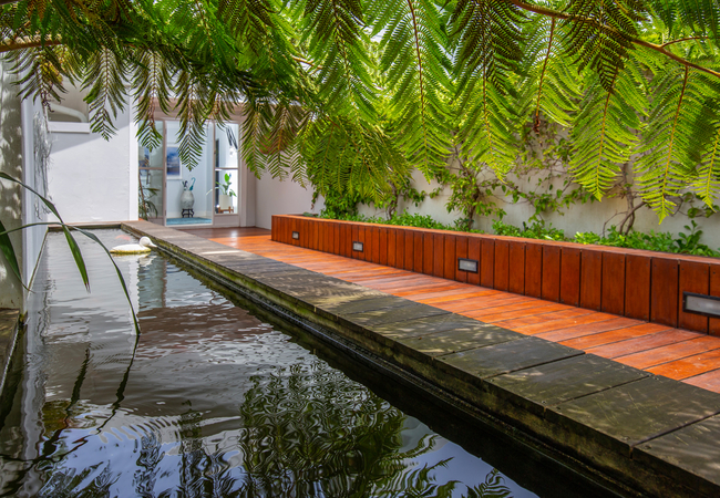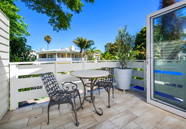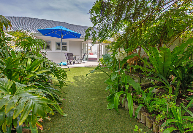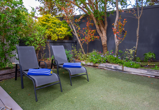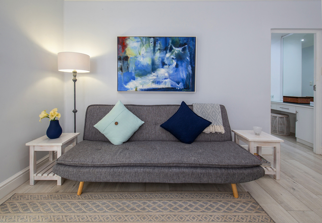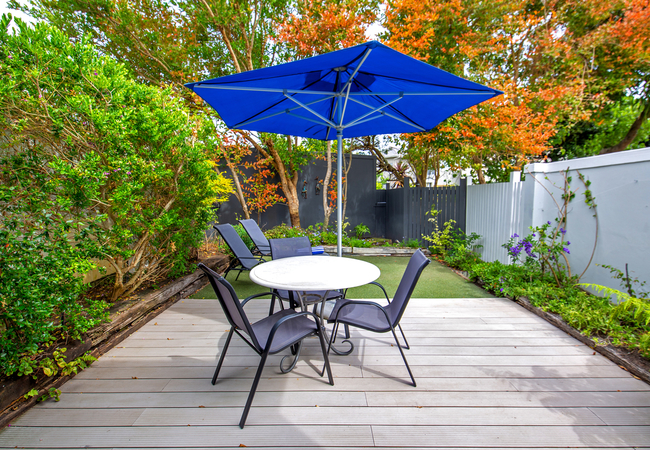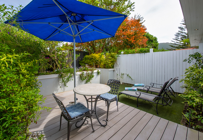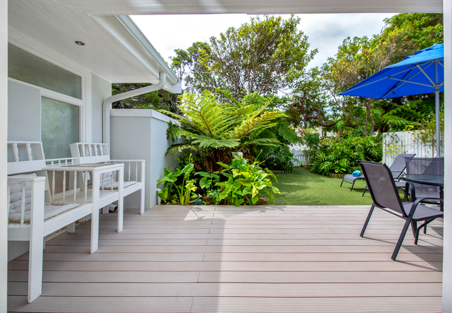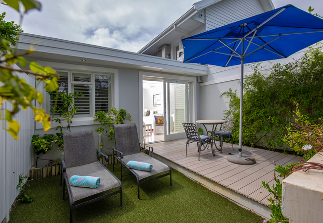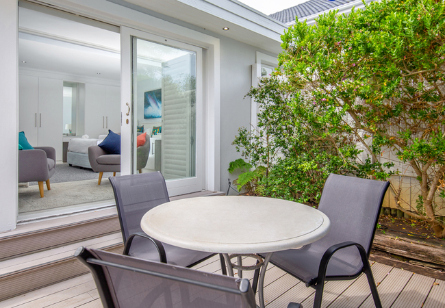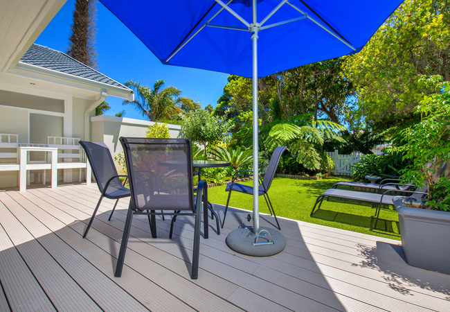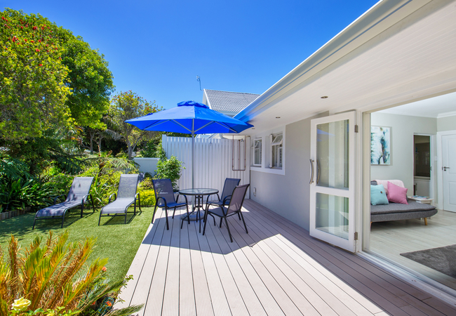 Mojo Suite is furnished with an extra length king-size bed and has a private entrance and garden. A double sleeper couch is in the suite, if required. The room is equipped with tea- and coffee-making facilities, air-conditioning with hot and cold settings, a work area with a USB port, Wi-Fi, a bar fridge, a digital safe, beach towels and a beach basket, a beach umbrella, cupboards for clothing and baggage storage, a dressing table with a mirror and hairdryer, and a TV with selected DSTV channels and Netflix. The bathroom has a bath, shower, double basin and heated towel rail. Their is a grassed area and a deck in the private garden with a table and chairs, umbrella and a pair of loungers. An outside shower with hot and cold water is on the deck to rinse off after visits to the beach. Designated parking for this suite is directly in front of the it.