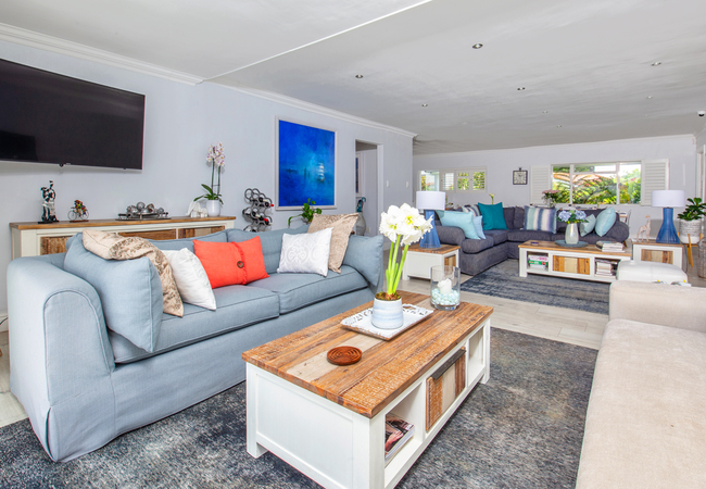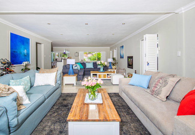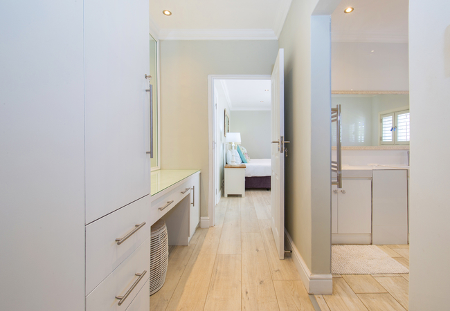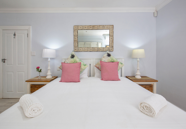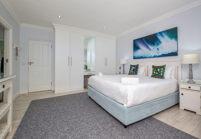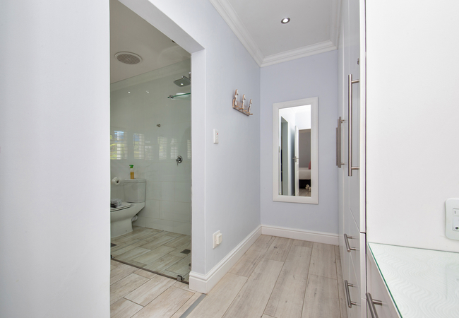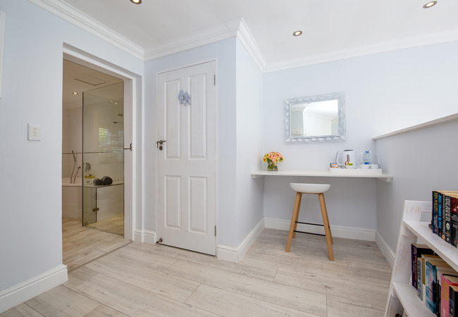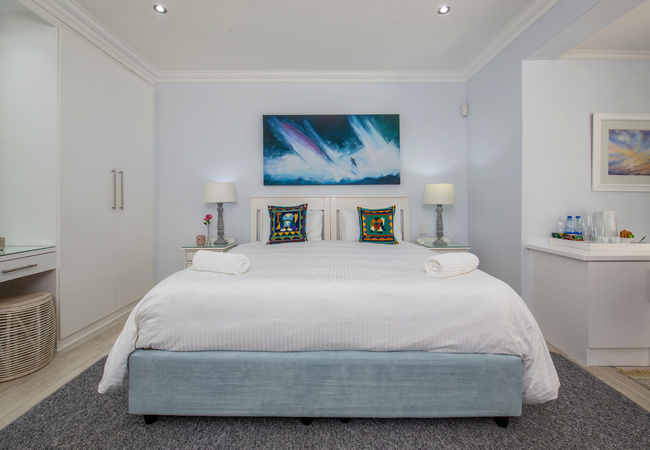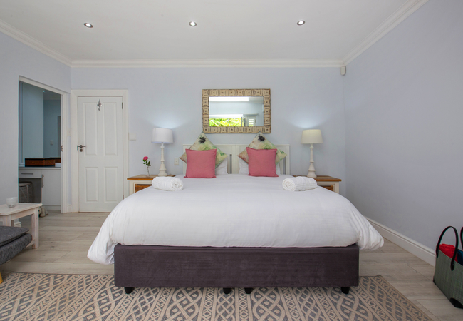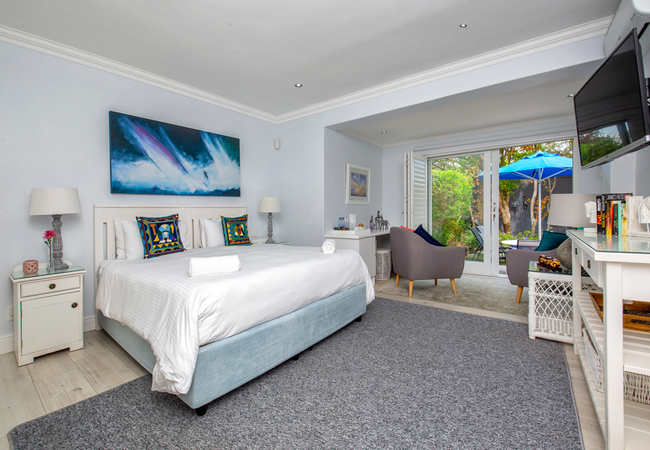 Sam Suite is furnished with an extra length king-size bed and has a private entrance and garden. The room is equipped with tea- and coffee-making facilities, air-conditioning with hot and cold settings, a work area with a USB port, Wi-Fi, a bar fridge, a digital safe, beach towels and a beach basket, a beach umbrella, cupboards for clothing and baggage storage, a dressing table with a mirror and hairdryer, and a TV with selected DSTV channels and Netflix. The bathroom has a bath, shower, double basin and heated towel rail. Their is a grassed area and a deck in the private garden with a table and chairs, umbrella and a pair of loungers. An outside shower with hot and cold water is on the deck to rinse off after visits to the beach.