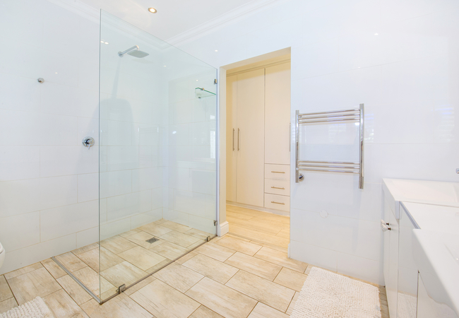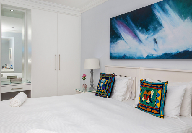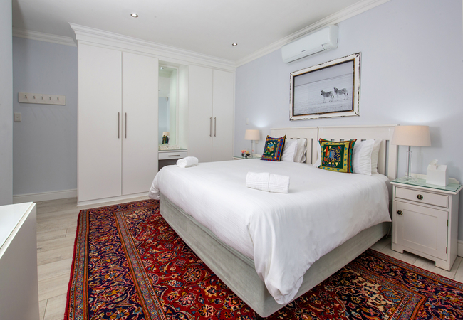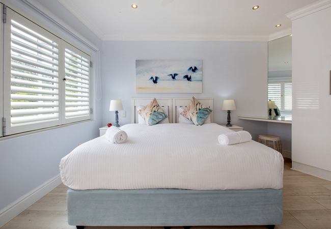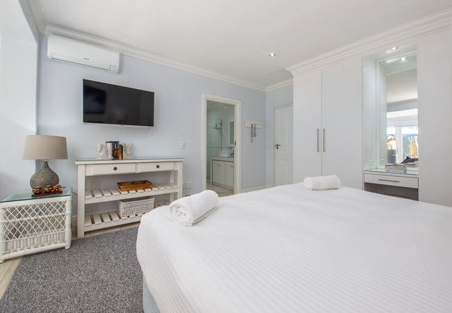 Clyde Suite is upstairs and is furnished with an extra length king-size bed and has a balcony. A double sleeper couch is in the suite, if required. The room is equipped with tea- and coffee-making facilities, air-conditioning with hot and cold settings, a work area with a USB port, Wi-Fi, a bar fridge, a digital safe, beach towels and a beach basket, a beach umbrella, cupboards for clothing and baggage storage, a dressing table with a mirror and hairdryer, and a TV with selected DSTV channels and Netflix. The bathroom has a bath, an double shower, double basin and heated towel rail. The balcony has a table, chairs and an umbrella.