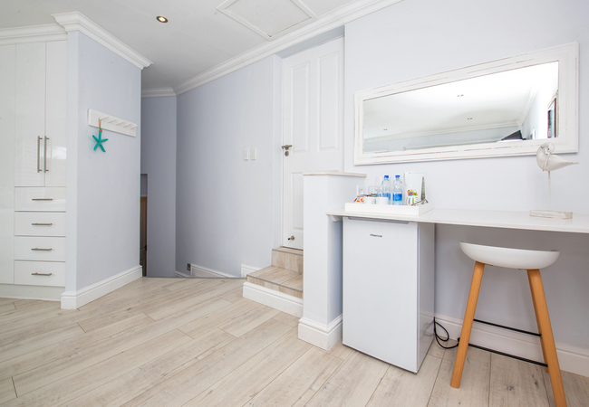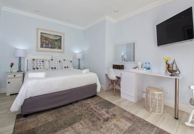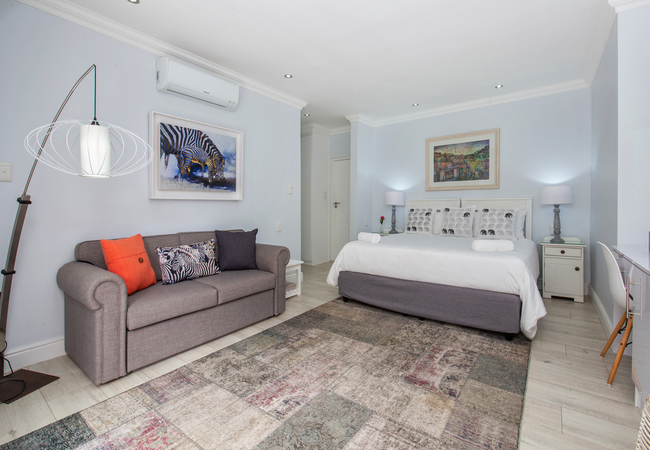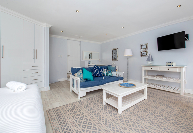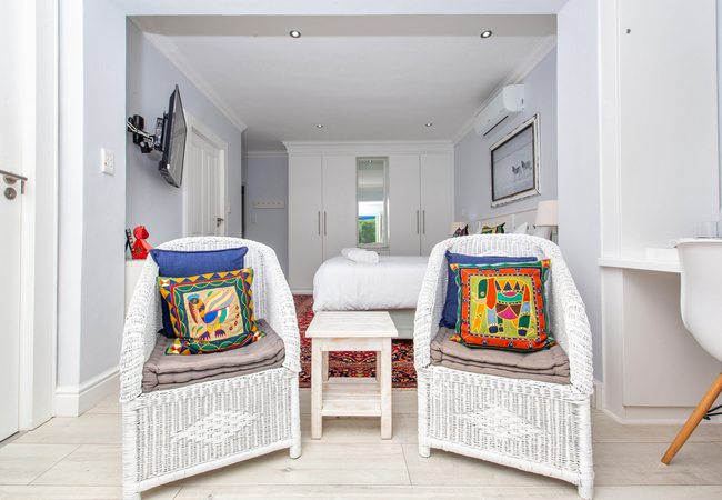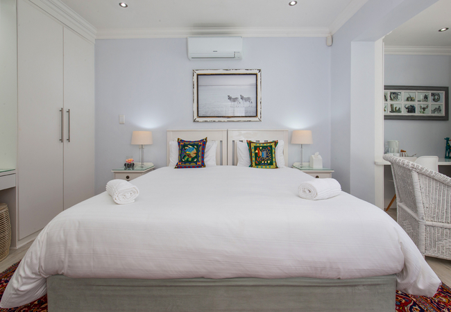 Gizmo Suite is furnished with an extra length king-size bed and has a private entrance and a garden. A double sleeper couch is in the suite, if required. The room is equipped with tea- and coffee-making facilities, air-conditioning with hot and cold settings, a work area with a USB port, Wi-Fi, a bar fridge, a digital safe, beach towels and a beach basket, a beach umbrella, cupboards for clothing and baggage storage, a dressing table with a mirror and hairdryer, and a TV with selected DSTV channels and Netflix. The bathroom has a bath, shower, double basin and heated towel rail. Their is a grassed area and a deck in the private garden with a table and chairs, umbrella and a pair of loungers. An outside shower with hot and cold water is on the deck to rinse off after visits to the beach. Designated parking for this suite is directly in front of the it.