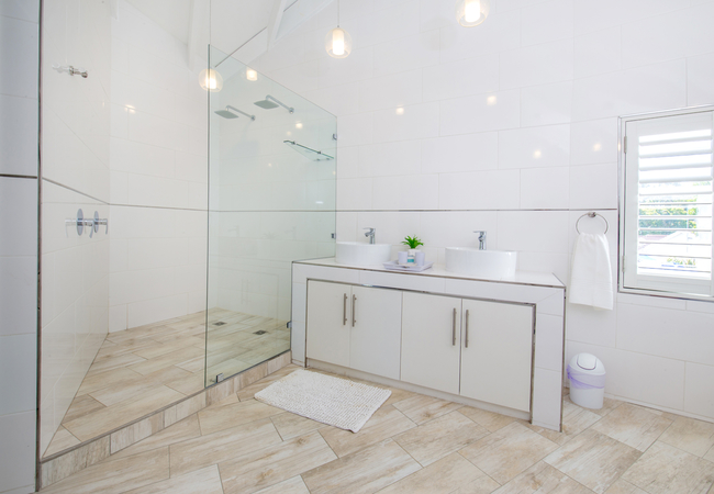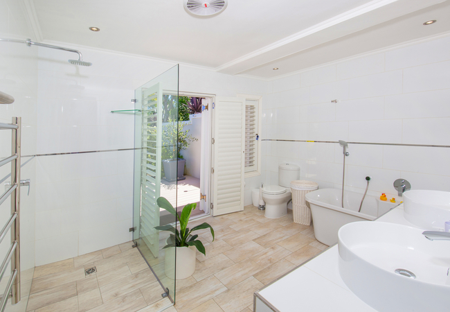 Max Suite is furnished with an extra length king-size bed and has a private garden. The room is equipped with tea- and coffee-making facilities, air-conditioning with hot and cold settings, a work area with a USB port, Wi-Fi, a bar fridge, a digital safe, beach towels and a beach basket, a beach umbrella, cupboards for clothing and baggage storage, a dressing table with a mirror and hairdryer, and a TV with selected DSTV channels and Netflix. The bathroom has a bath, shower, double basin and heated towel rail. Their is a grassed area and a deck in the private garden with a table and chairs, umbrella and a pair of loungers. An outside shower with hot and cold water is on the deck to rinse off after visits to the beach.
