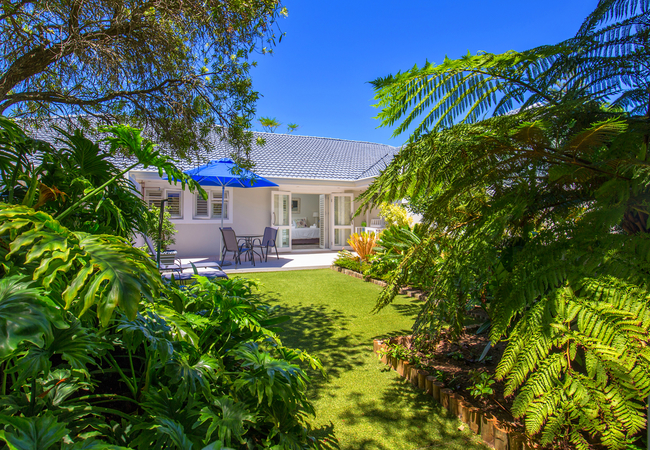 Bonny Suite is furnished with an extra-length king-size bed and has a private entrance and garden. A double sleeper couch is in the suite, if required. The room is equipped with tea- and coffee-making facilities, air-conditioning with hot and cold settings, a work area with a USB port, Wi-Fi, a bar fridge, a digital safe, beach towels, and a beach basket, a beach umbrella, cupboards for clothing and baggage storage, a dressing table with a mirror and hairdryer, and a TV with selected DSTV channels and Netflix. The bathroom has a bath, shower, double basin, and heated towel rail. There is a grassed area in the private garden with a table and chairs, an umbrella, and a pair of loungers. An outside shower with hot and cold water to rinse off after visits to the beach. Designated parking for this suite is directly in front of the unit.