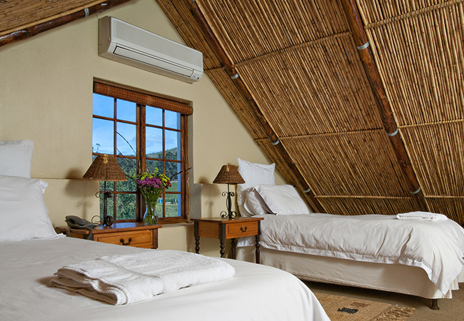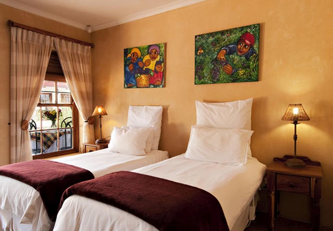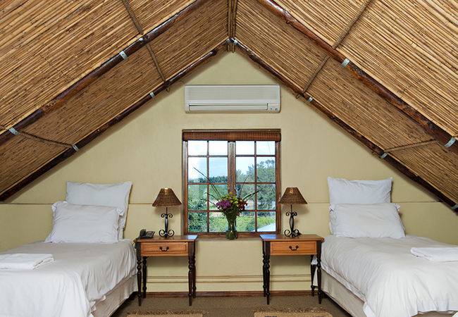 The twin rooms are furnished with twin / two single beds (can be converted into a double bed). The en-suite bathrooms are equipped with a shower, hand basin and WC. The rooms are situated in our beautiful gardens with views of the spectacular Hottentots-Holland Mountains.