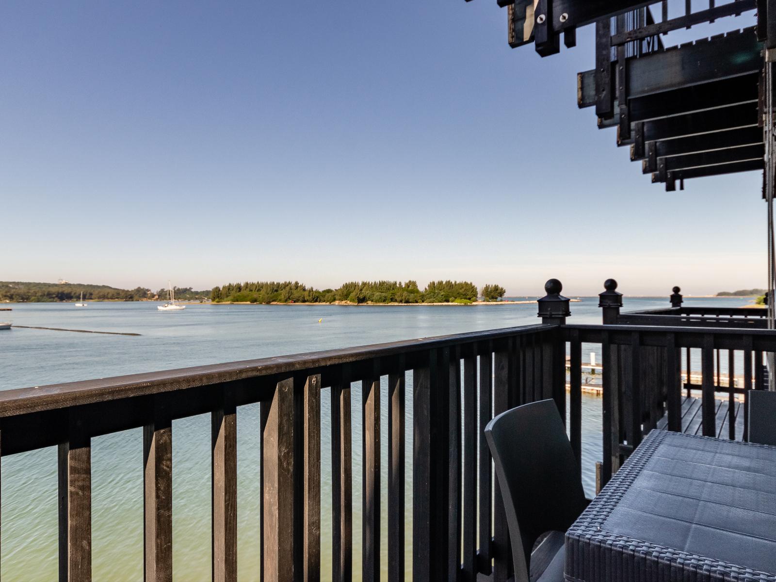 Sliding doors lead from the living area onto a wooden deck with seating and views of the canal. The unit is serviced daily.
