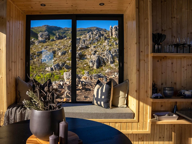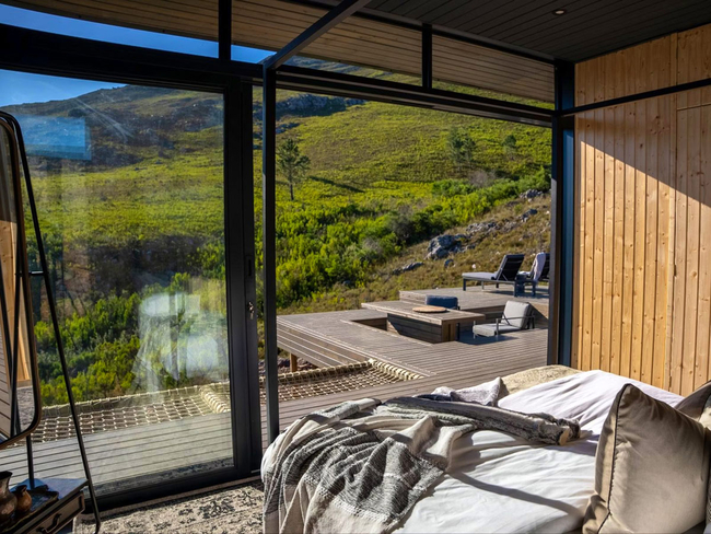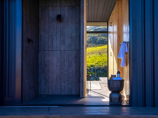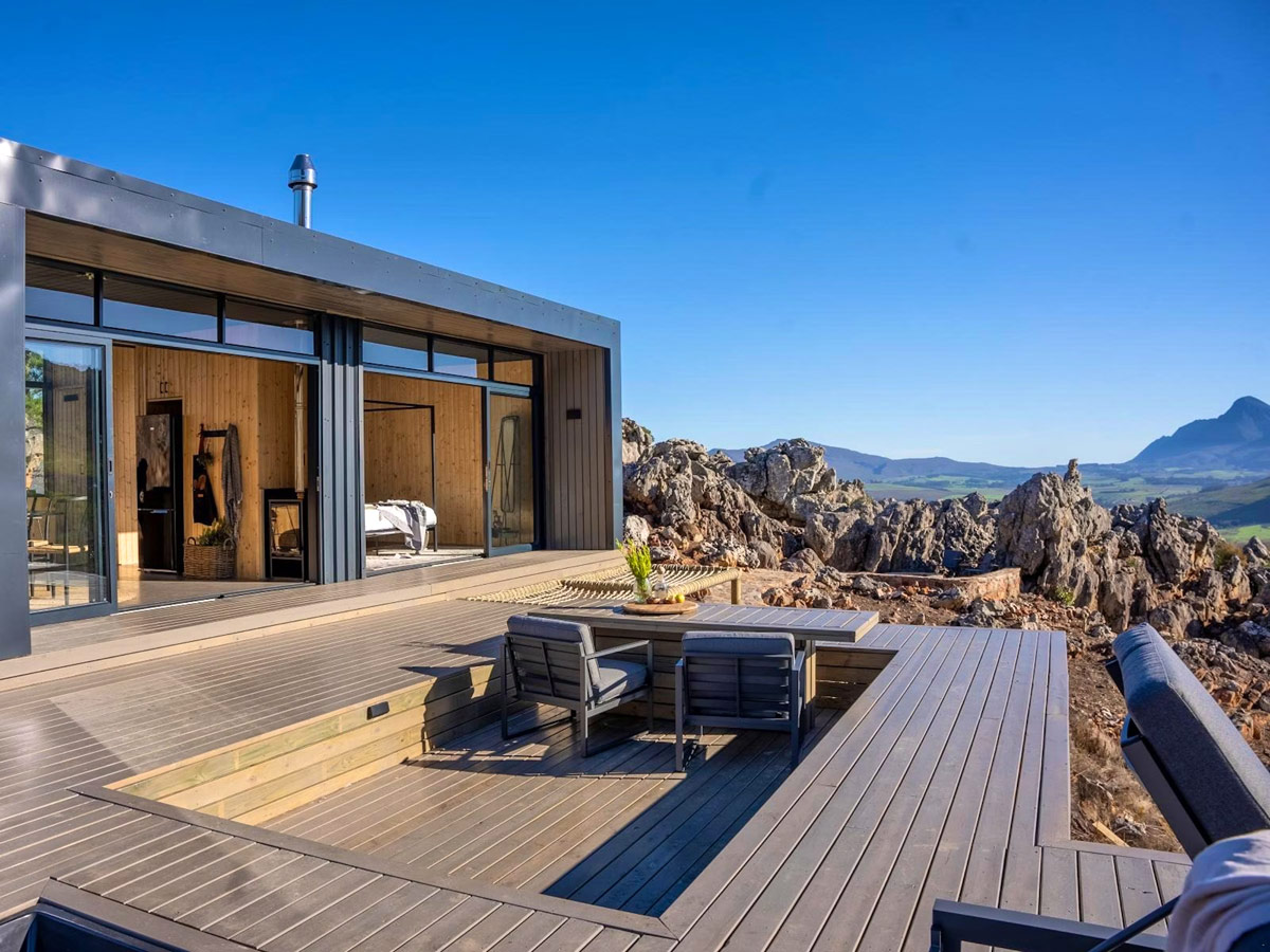 This solar-powered cabin is nestled in the heart of the Hemel en Aarde Valley, just 15 km from central Caledon. It boasts breathtaking views, surrounded by majestic mountains and pristine nature. We have designed this romantic getaway with meticulous attention to detail to embody peace and tranquillity. This solar-powered cabin is nestled in the heart of the Hemel en Aarde Valley, just 15 km from central Caledon. It boasts breathtaking views, surrounded by majestic mountains and pristine nature. We have designed this romantic getaway with meticulous attention to detail to embody peace and tranquillity. Indulge in unparalleled seclusion at this luxurious cabin for two. Picture yourself showering with panoramic mountain views, thanks to the wide-opening glass walls. Unwind on the expansive deck, complete with a sun lounger, a hammock, and a soothing wood-fired hot tub beneath a canopy of stars. Prepare delightful meals in the fully equipped kitchenette, then head to the nearby BBQ/braai area, seemingly carved from nature itself, for an unforgettable outdoor dining experience. The luxury cabin boasts stunning mountain views and comprises one bedroom and one bathroom. The cabin features a well-equipped kitchenette with a gas stove and BBQ/braai facilities. The cabin is non-smoking and offers a comfortable sitting area, a fireplace, and a dining table. Additional amenities include a cleaning service, non-feather pillows, and views of both the pool and the mountains. The bathroom is equipped with a shower, bathrobe, and slippers. Guests can enjoy coffee and tea facilities, a refrigerator, a two-plate stove, a patio, a terrace, and a plunge pool. Outdoor amenities include furniture, a KokKol wood-fired hot tub, an outdoor dining area, and BBQ/braai facilities. Unwind on the expansive deck, complete with a sun lounger, a hammock, and a soothing wood-fired hot tub beneath a canopy of stars. Prepare delightful meals in the fully equipped kitchenette, then head to the nearby BBQ/braai area, seemingly carved from nature itself, for an unforgettable outdoor dining experience.