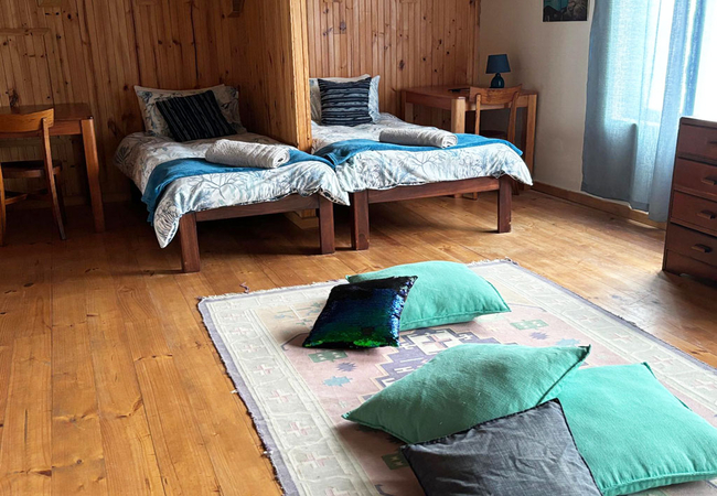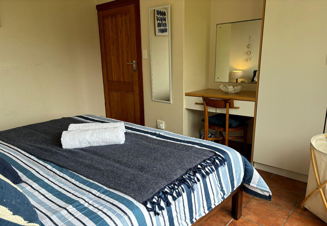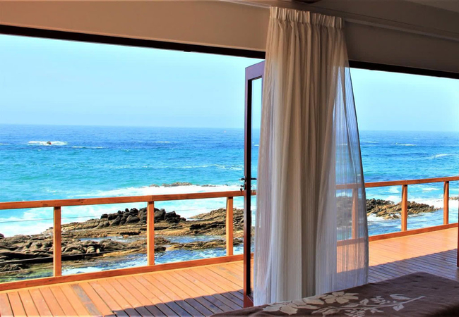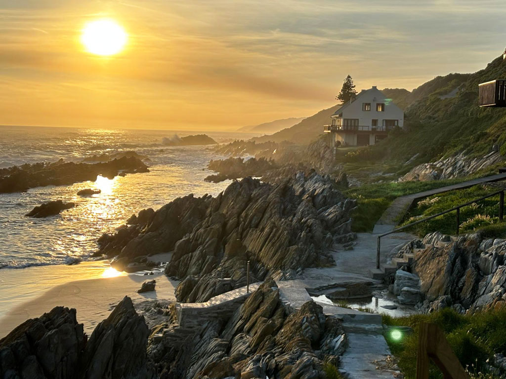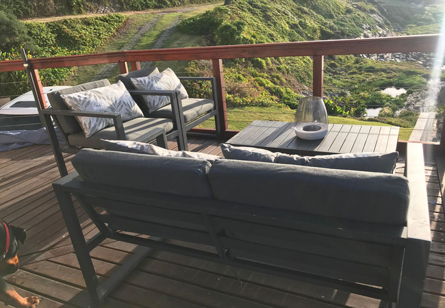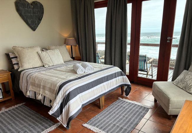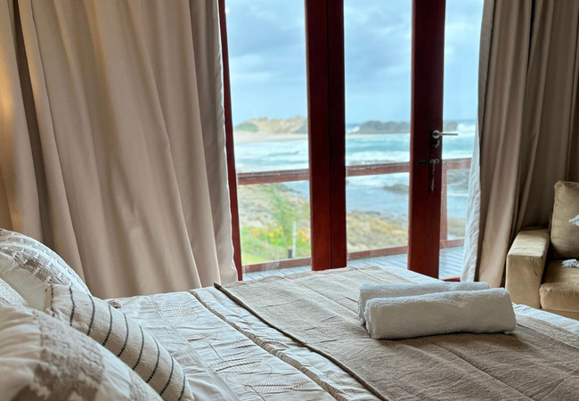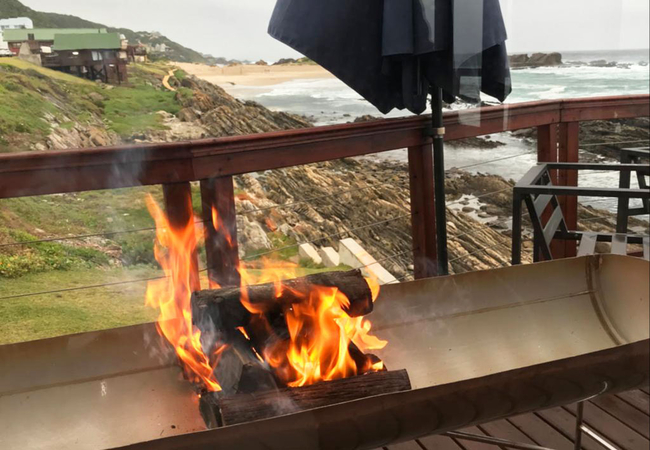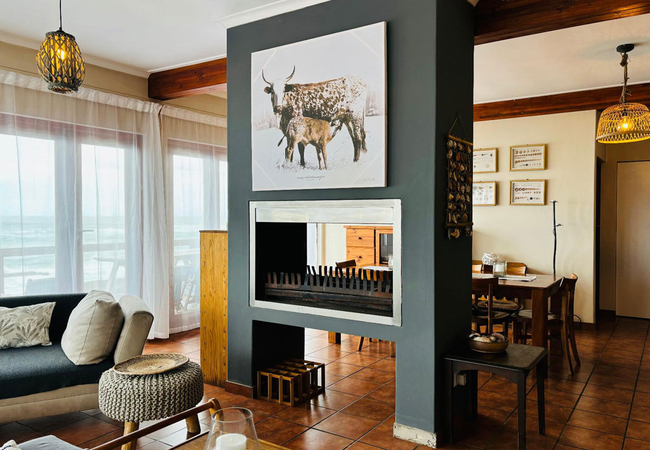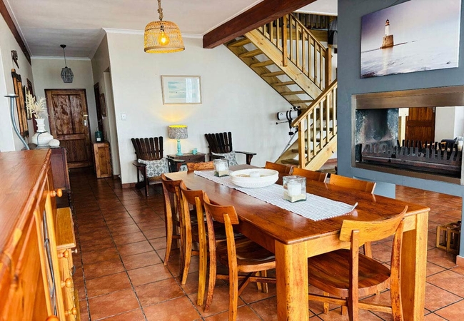 On the Rocks @ E offers five bedrooms and five bathrooms. The spacious kitchen is fitted with a 4 plates electric stove, an electric oven, a full-size fridge and upright freezer, microwave oven, electric kettle. An old Italian moka is available to those who appreciate a good coffee any time of the day. The kitchen also has a one burner butane powered stove in case of loadshedding. Upon entering through the main door, situated on the west side of the wrap-around wooden deck, guests are greeted by a spacious, open-plan living area that seamlessly merges with the outdoor terrace, providing breath-taking views of the ocean and the nearby beach. The stacking doors are collapsable and, on a windless day, you will enjoy the most amazing views from the comfort of the ample sofas. The imposing fireplace, accessible from both dining and living areas, makes this villa the ideal destination during the winter months as well. Just to make sure that you fully enjoy every season of the year, we keep cozy blankets standing by the sofa, for those afternoon snoozes you know!