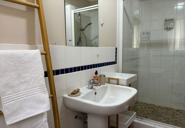 The Garden Room is furnished with a King-size bed and is located on the main level opposite the Ocean View Room with which it shares, through separate access, the use of the bathroom with shower. You can spot whales and dolphins from your bed.
