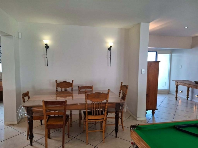 The open-plan kitchen is fully equipped with modern conveniences, including a fridge-freezer, microwave, oven, gas stove, and all the essentials for easy meal preparation. The inviting living area offers a dining table, comfortable seating, a pool table, and a built-in braai, making it an ideal space for socializing and relaxation.
