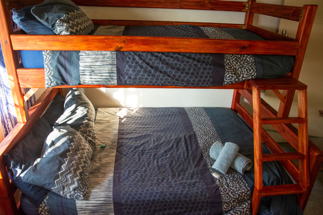 The second bedroom offers a double bed with a dark wood finish and the third bedroom has an Oregon bunk bed with a single bed at the top and a double bed at the bottom. A bathroom with a shower is shared by these two rooms. A sleeper couch in the living area provides an additional bed for one guest.