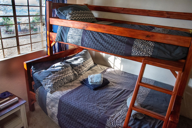 Bedroom one has a Queen-size bed, bedroom two has a Double bed, bedroom three has a Tri-bunk and then there is a sleeper couch in the living area. The house has a dining room and a fully equipped kitchen with a gas stove, oven, microwave and equipment to cook up a special dinner for your loved ones. You can relax and unwind in the spacious open plan lounge or on the deck chairs in the garden with a panoramic view of the river. If you are up for some adventure, take a walk up the "klip koppie" to get a breath-taking view of the dam.