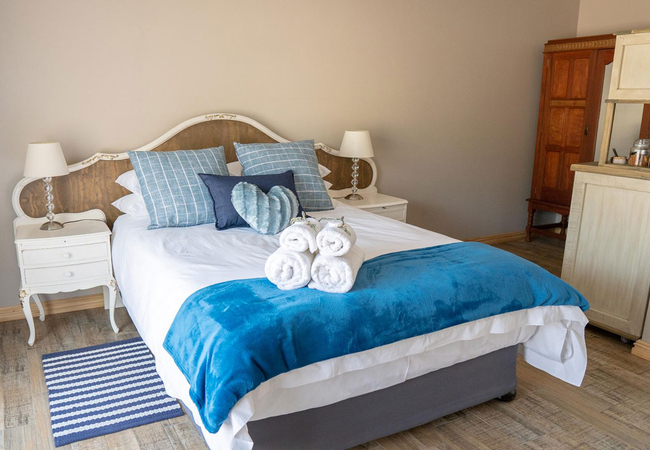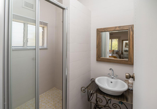 Madeliefie Room is spacious and furnished with a King-size bed and a single bed. The en-suite bathroom is fitted with a shower, basin and separate toilet. All the rooms have Wi-Fi, TV with satellite channels, a fridge, tea / coffee station and are air-conditioned. This room is on the upper level with stairs only. The guesthouse has a braai area, secure parking and a garden. Parking is available on site.