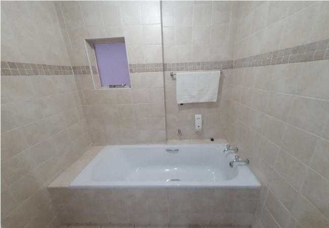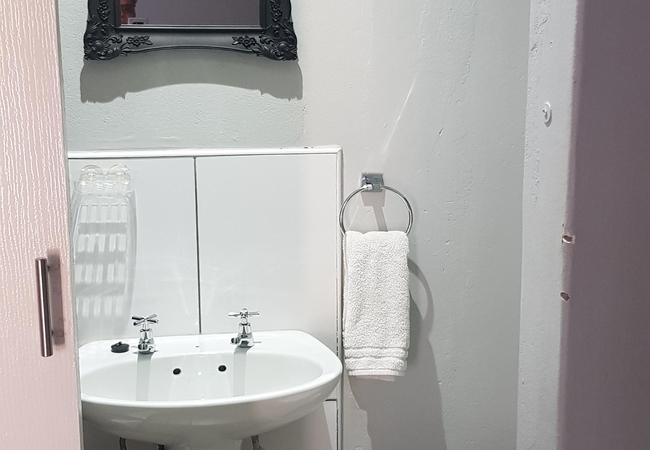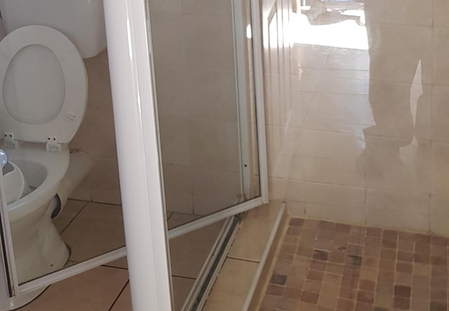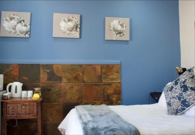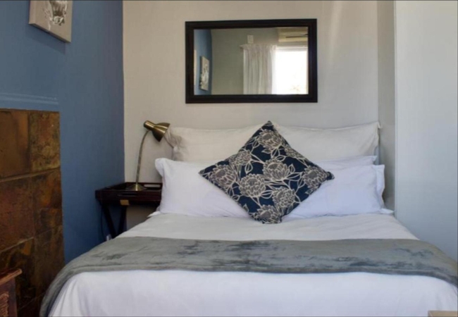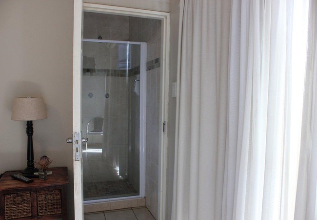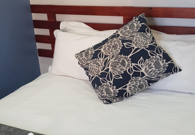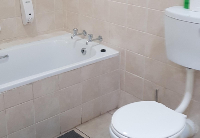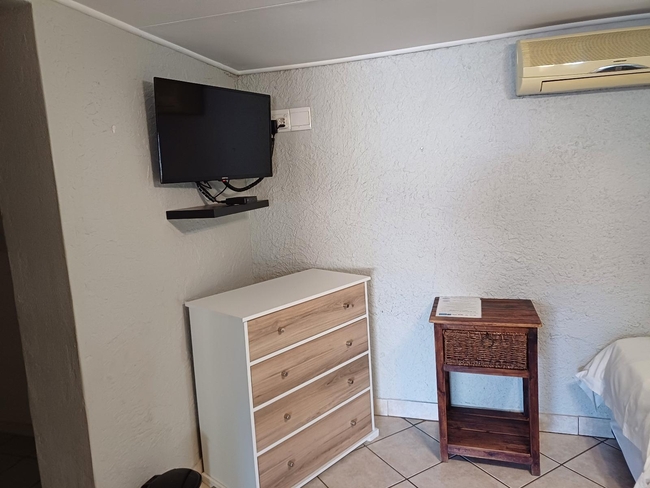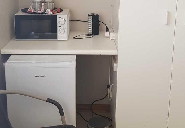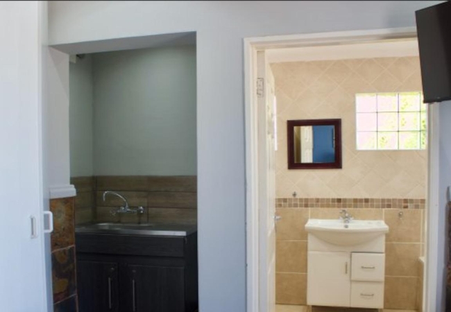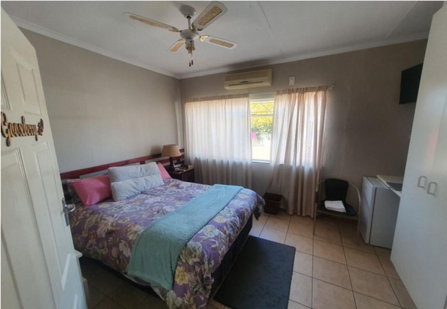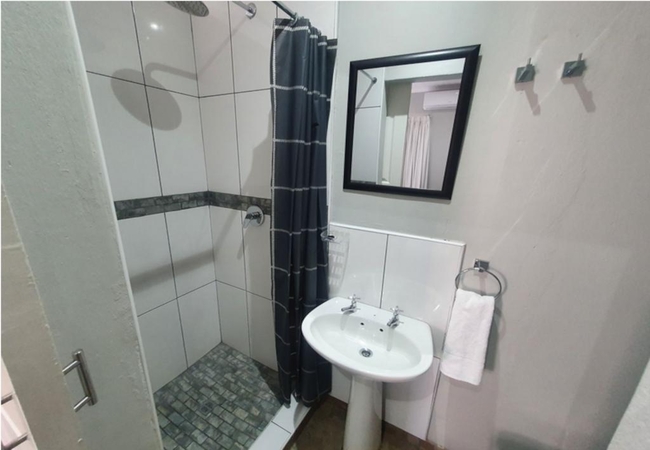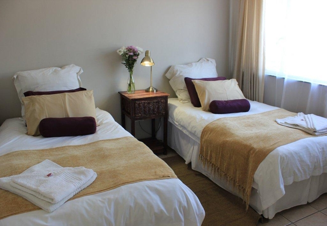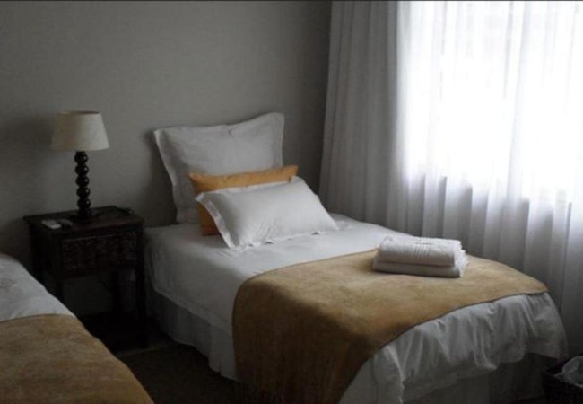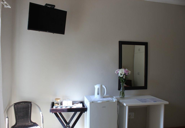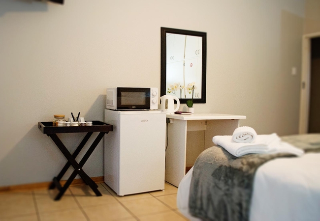 This lovely private room is located in a quiet part of the guest house. It is furnished with twin beds and a work desk. The en-suite bathroom is fitted with a shower, toilet and basin. The room has a tea and coffee station, bar fridge, microwave, and a TV with DStv.