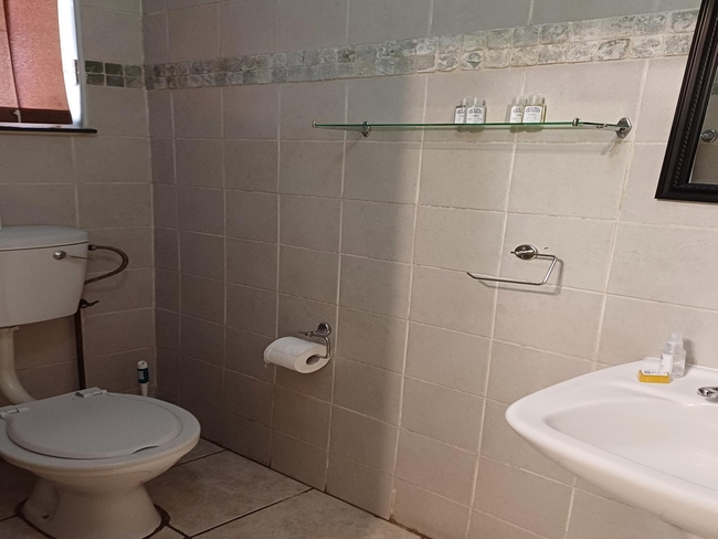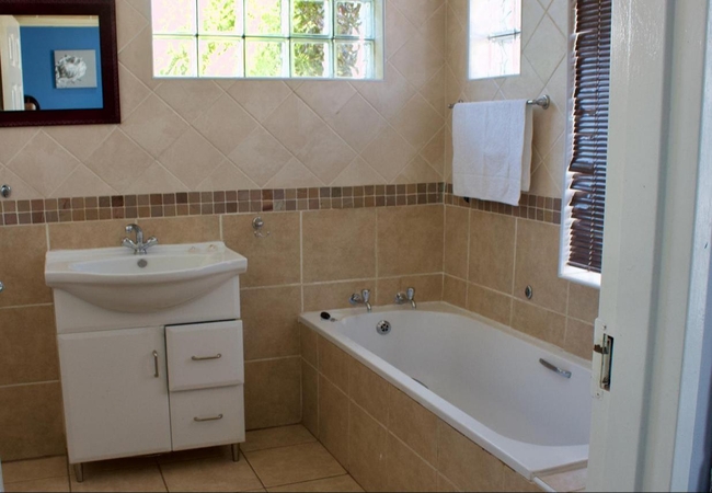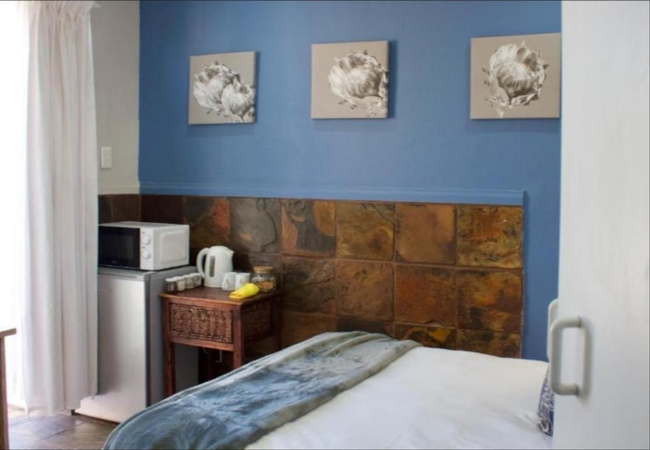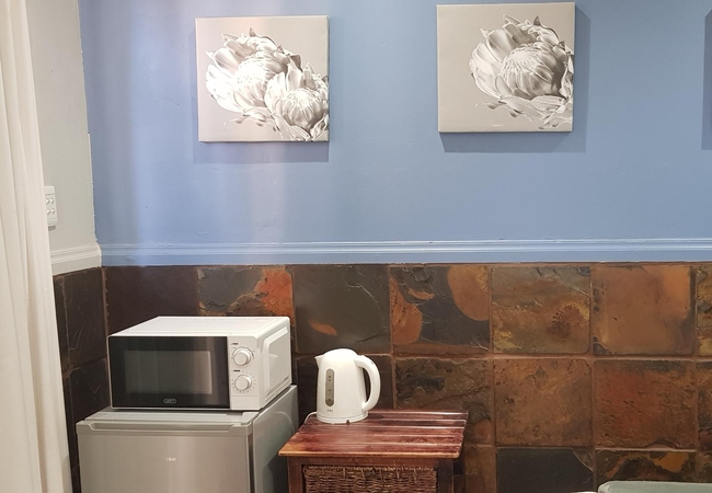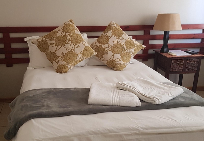 This air-conditioned room is furnished with a double bed, a work desk, an has an en-suite bathroom fitted with a bath, toilet and basin. There is a washing up sink. The room has a tea and coffee station, bar fridge, microwave, and a TV with DStv.