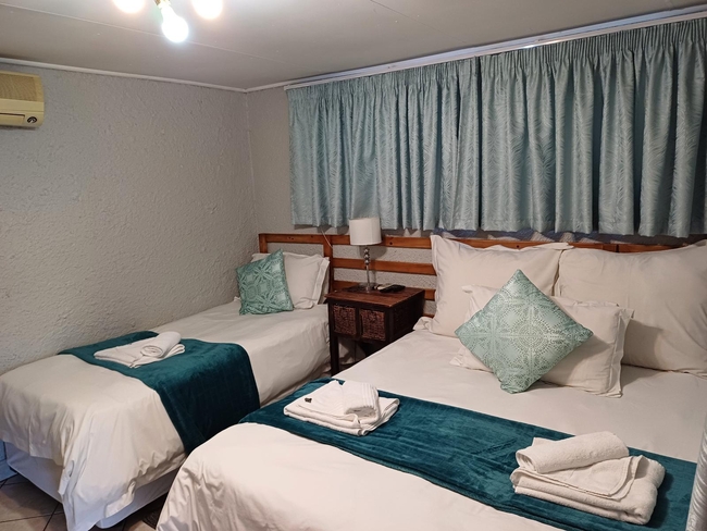 This lovely outside room is air-conditioned and furnished with a Queen-size and single bed, and has an en-suite bathroom fitted with a shower, basin and toilet. The room is also equipped with a kitchenette which has a tea and coffee station, bar fridge and microwave there is also a TV with DSTV and wifi.