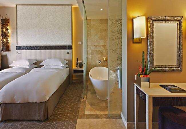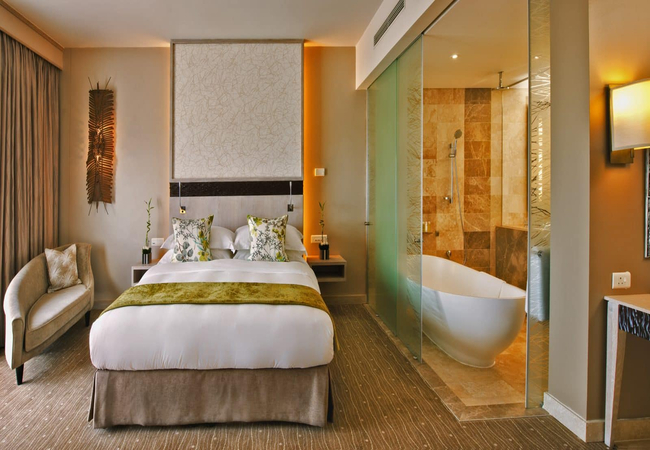 Spacious 45-square-metre room offers contemporary style and home-like comfort, featuring a plush King-size bed, balcony and deluxe bath with walk-in shower, separate tub and environmentally friendly bath products. Enjoy panoramic views of the Indian Ocean, plus modern amenities such as 32-inch LCD TV and high-speed wired Internet access.