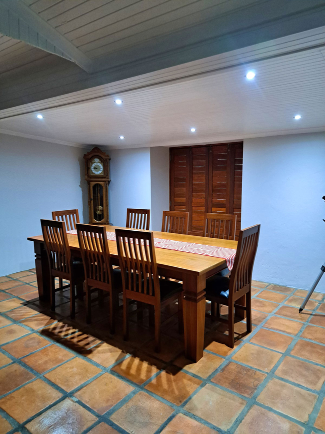 The dining area seats eight guests, and the house includes an indoor and outdoor barbecue, a pizza oven, and a fireplace. Free Wi-Fi and a TV with full DSTV are available for entertainment. The veranda features a swimming pool, outdoor furniture, and a wood-fired hot tub.