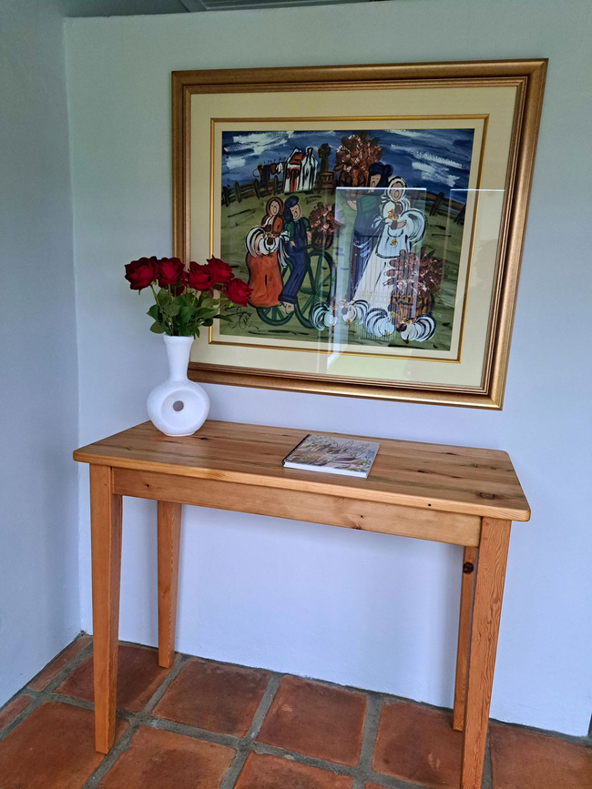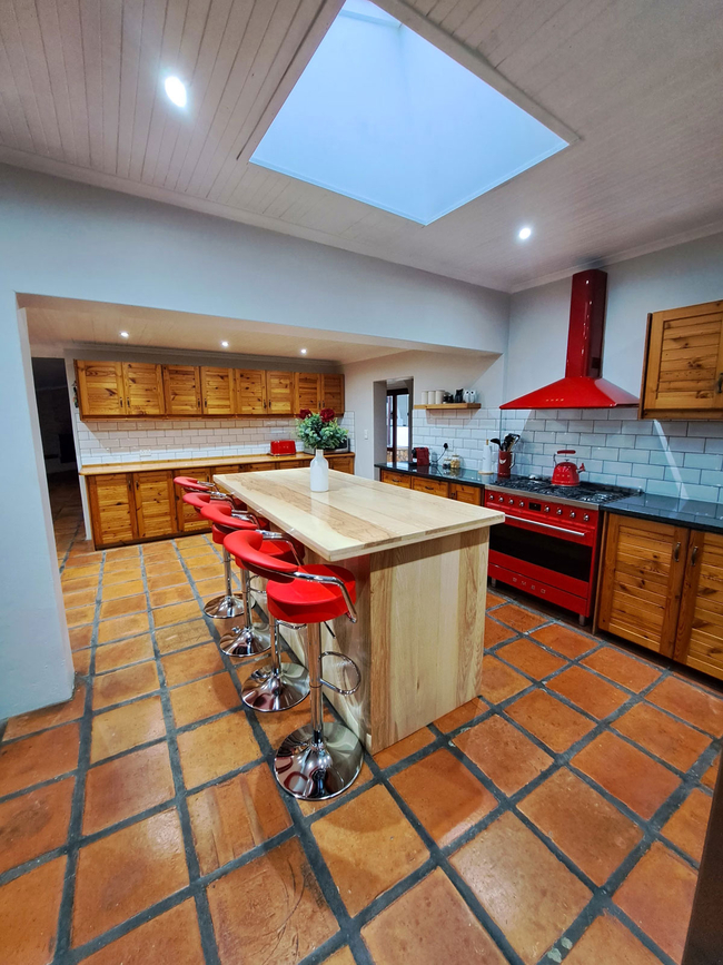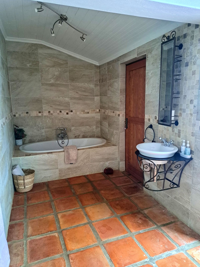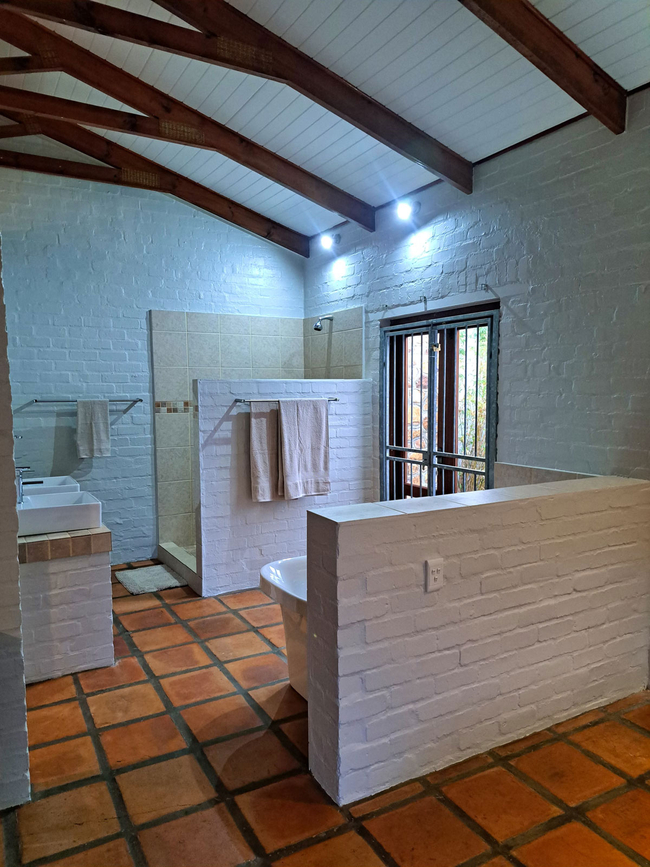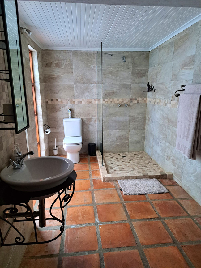 The Luxury Holiday Home features three bedrooms and two bathrooms in the main house, along with a one-bedroom flat, accommodating up to eight guests. The home is equipped with a fully stocked kitchen, including a dishwasher, Nespresso machine, and other modern appliances. Guests can enjoy indoor and outdoor BBQ facilities, a pizza oven, a private swimming pool, and a wood-fired hot tub with stunning views of the mountains and farmland. The main house includes three bedrooms: the master suite has a queen-size bed and an en-suite bathroom with a shower, bath, toilet, and sink. The second bedroom offers a double bed, while the third has two single beds. These two bedrooms share a bathroom with a shower, bath, toilet, and sink. Additionally, the separate apartment accommodates two guests with a double bed, a small living area, and a private bathroom equipped with a shower, sink, and toilet. The kitchen is well-appointed with a refrigerator, gas stove and oven, microwave, toaster, dishwasher, Nespresso machine, and all necessary cutlery and crockery, along with tea and coffee-making facilities. The dining area seats eight guests, and the house includes an indoor and outdoor barbecue, a pizza oven, and a fireplace. Free Wi-Fi and a TV with full DSTV are available for entertainment. The veranda features a swimming pool, outdoor furniture, and a wood-fired hot tub.