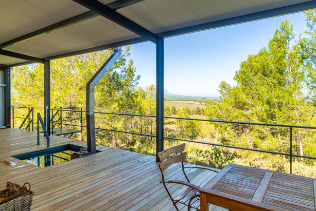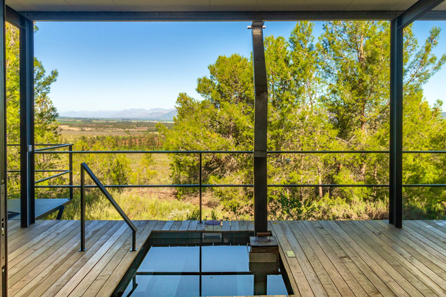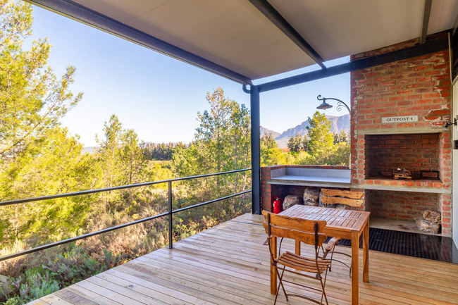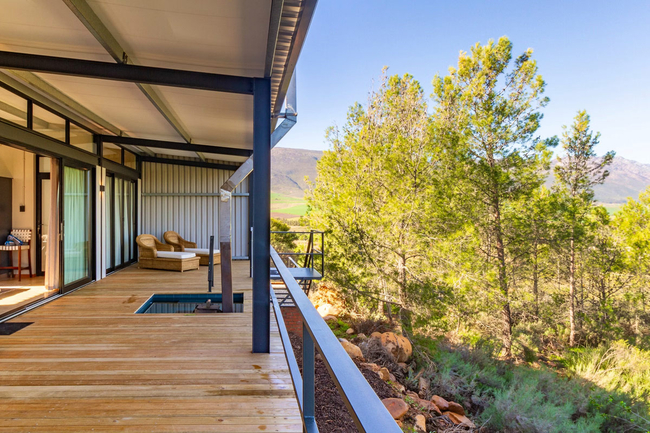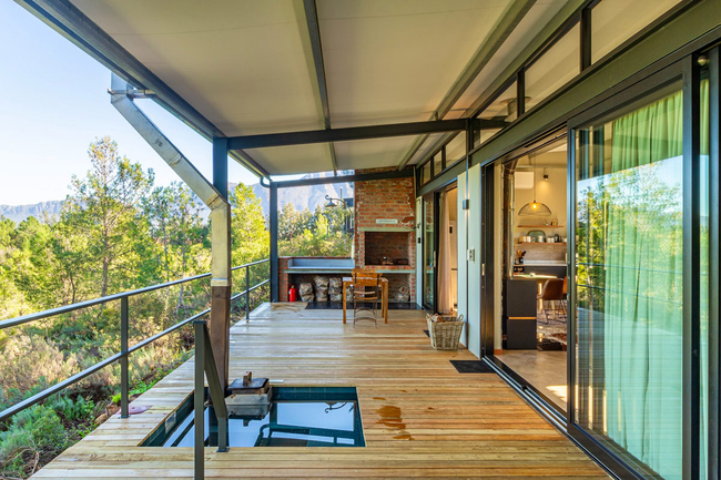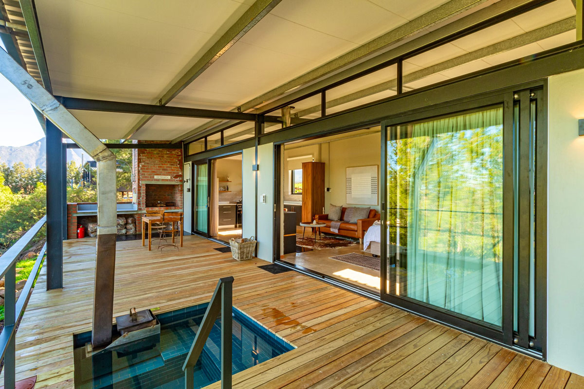 Large glass doors open onto a generously sized private deck, covered to ensure enjoyment in every season. This outdoor space is equipped with a built-in braai, a wood-fired hot tub, and a comfortable seating area that looks out over indigenous fynbos and distant mountain peaks.
