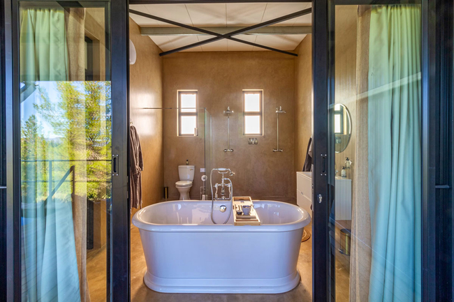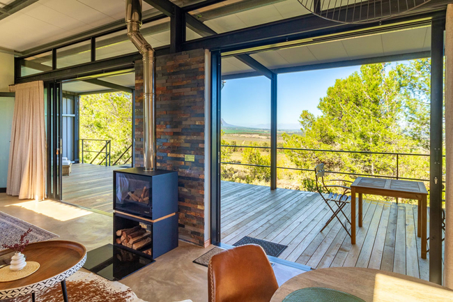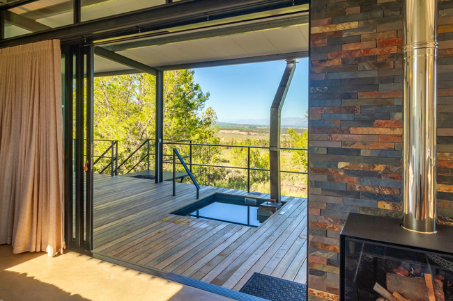 Large glass doors open onto a generously sized private deck, covered to ensure enjoyment in every season. This outdoor space is equipped with a built-in braai, a wood-fired hot tub, and a comfortable seating area that looks out over indigenous fynbos and distant mountain peaks. Inside, the air-conditioned pod has been tailored for two adults, with a spacious king-sized bed anchoring the open-plan sleeping area. The separate bathroom includes both a shower and a bathtub, offering guests the choice between a quick refresh or a long, relaxing soak. Soft towels, premium linen, and plush bathrobes are provided for added comfort throughout your stay. The kitchen is fully equipped with a gas stove, oven, microwave, kettle, and fridge-freezer, allowing guests to prepare meals with ease. Adjacent to the kitchen, the living and dining space blends functionality with warmth, featuring a built-in fireplace and comfortable seating that creates a homely yet stylish atmosphere. Complimentary Wi-Fi is available, along with a compact Bluetooth speaker for casual listening.