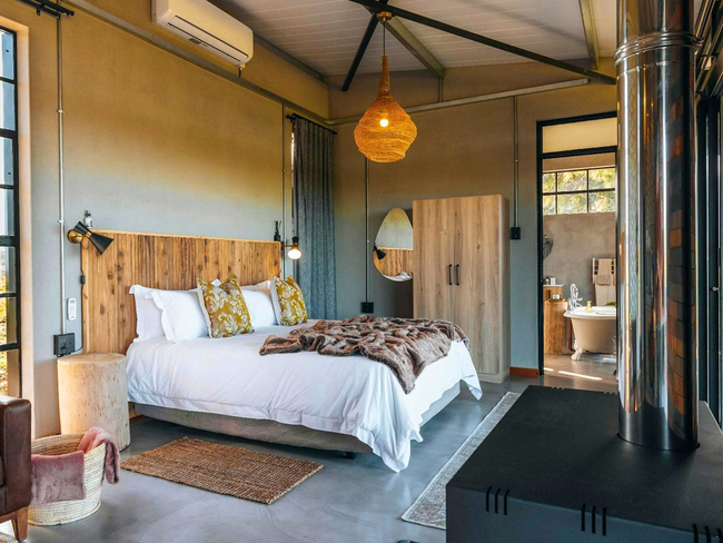Guests are welcomed by a private wooden deck that encourages outdoor living, complete with a built-in braai and a wood-fired hot tub. The setting offers tranquil views of the surrounding farmland, creating a relaxing space to soak up the sounds and stillness of country life.