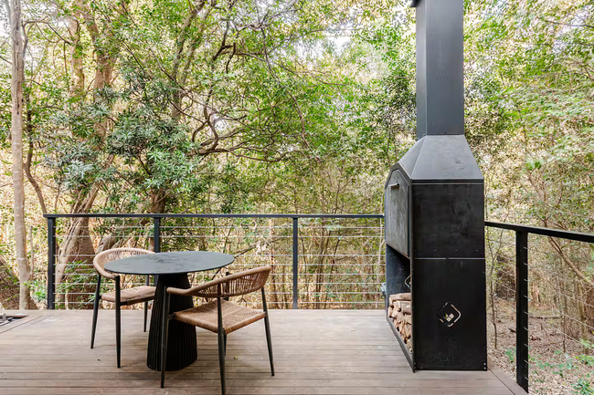 Yellowwood is a stylish one-bedroom cabin featuring a king-size bed that can be converted into singles, an en-suite bathroom, a full kitchen, and a comfortable lounge and dining area, complete with a double-sided fireplace. The deck is perfect for outdoor living, offering a wood-fired hot tub, braai facilities, and an outdoor dining area. The cabin comes with a range of modern amenities to ensure a comfortable stay, including Wi-Fi, TV with Netflix, heater, electric blankets, a cot, dining table, and a sitting area. The kitchen is fully equipped with a bar fridge, oven, two-plate stove, and coffee and tea facilities. Additional conveniences include a hairdryer, iron with ironing board, and outdoor furniture. Guests can enjoy garden views and the serene terrace, making it an ideal retreat for relaxation.