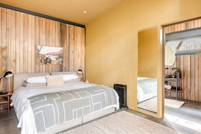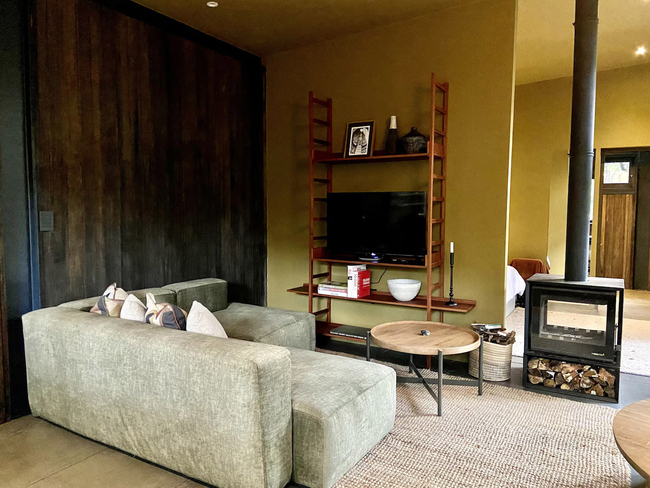 Yellowwood Cabin features one bedroom with a king-size bed that may be arranged as twin beds if required. The en-suite bathroom is well appointed, while the open-plan kitchen, dining space, and lounge with a double-sided fireplace create a warm and inviting atmosphere. The deck includes a wood-fired hot tub, outdoor dining area, and braai facilities, making it an ideal space to unwind.