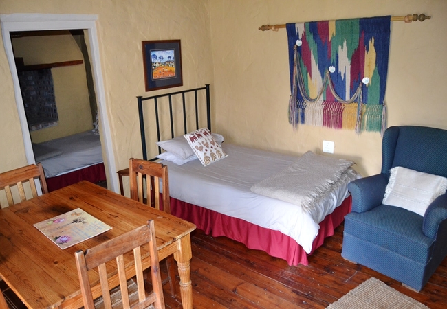 Welsch House Family Unit is a four sleeper unit. The rooms have wooden floors and reed ceilings and vine covered veranda. Fully equipped kitchen, one bedroom is furnished with a double bed, the second bedroom is furnished with a three-quarter bed and there is an additional three-quarter bed in the living area. The bathroom is en-suite of the main bedroom with both shower and bath. Located on an elevated section of the farm, wonderful vistas of the valley can be enjoyed from the vine covered veranda. A braai area with swimming pool is situated alongside the Welsch House.