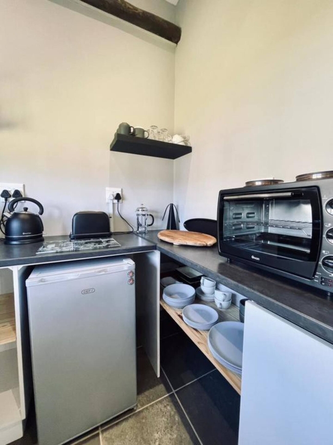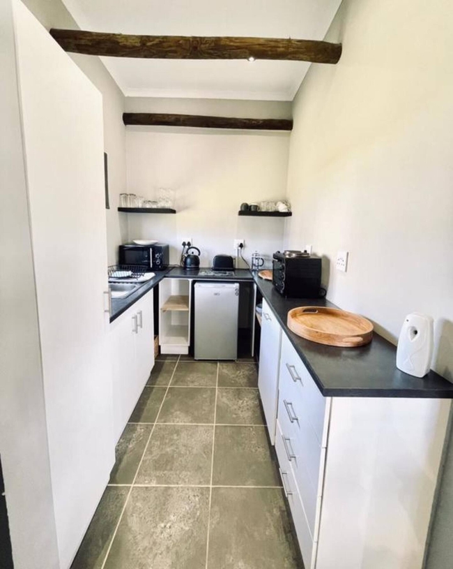 The open-plan kitchen, dining, and living area is fully appointed for self-catering, including a two-plate mini-stove with oven, bar fridge, microwave, kettle, toaster, and coffee plunger. Guests can enjoy meals at a four-seater dining table and unwind in the lounge area, which includes a fireplace. For entertainment, the cottage provides a TV and music speaker.