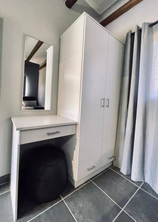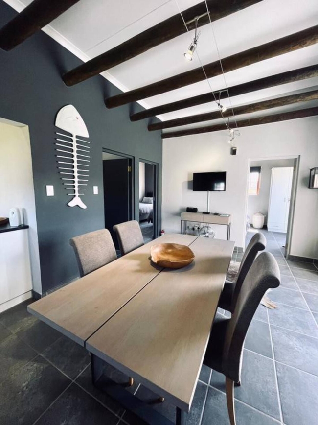 The cottage extends to a charming private patio that features a six-seater dining table with chairs, an umbrella, a braai facility, and a potjie pot. Limited Wi-Fi is available, and the property includes shared access to a jetty, ideal for launching and mooring boats.