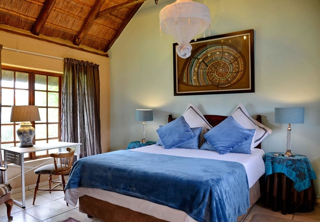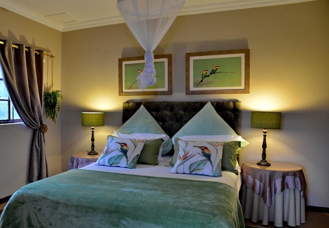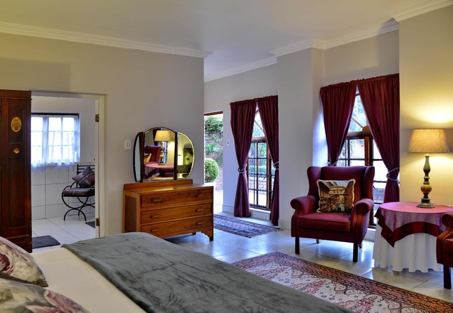 The Deluxe Queen Room is furnished with a Queen-size bed. The en-suite bathroom is equipped with a bath and shower combo, hand basin and toilet. Equipped with complimentary refreshment station with mineral waters, tea, coffee and rusks and percale linen. Amenities include bathrobe, wake-up calls, wireless internet connection, Coffee/Tea maker, Television and DSTV/ Satellite television, converters/ voltage adaptor, desk, hairdryer, microwave, non-smoking, refrigerator.