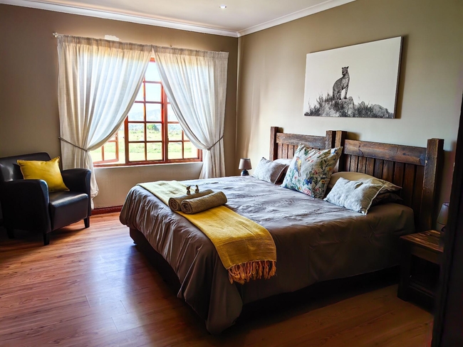 The rustic two bedroom cottage has an open plan kitchen / lounge area opening onto a veranda overlooking Pabala Game Farm and mountain scenery. Wake up to the sounds of farm animals, welcoming the new day!