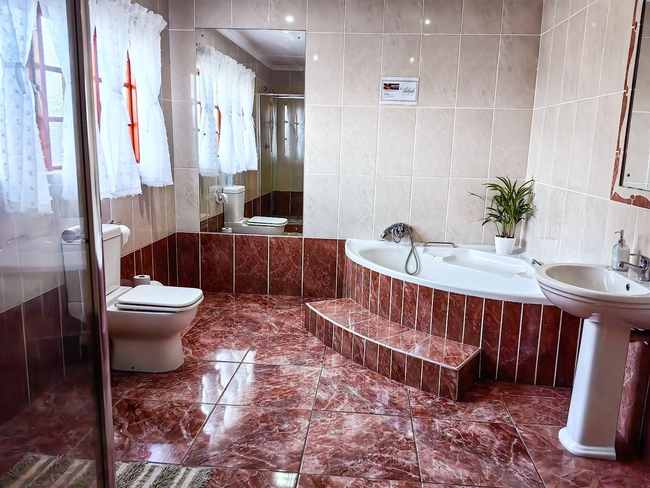 The family room features 1 King Size bed and 2 single beds. These 2 rooms shares an external bathroom and is equipped with a separate tub and shower, as well as a basin and toilet. The room has a ceiling fan, and a cleaning service is available.