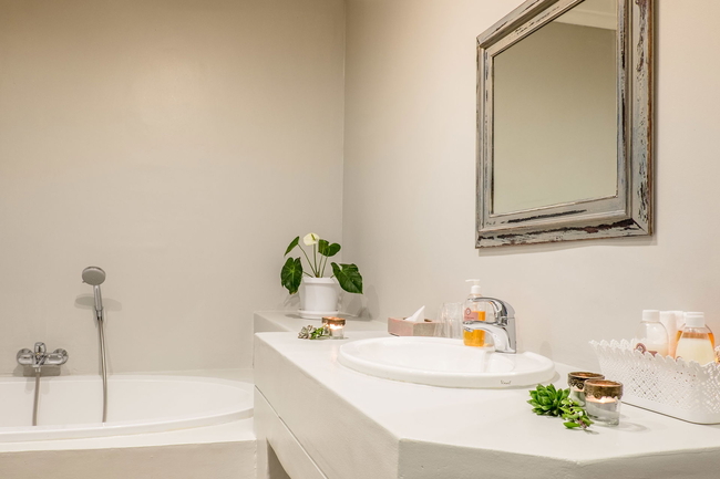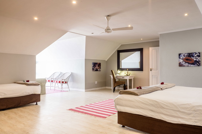 Palm Apartment has two bedrooms. The ground floor bedroom is furnished with an extra length King-size bed and has a full en-suite bathroom. There is a reading nook located off the ground floor bedroom - perfect for hiding away with your favorite magazine. The first floor bedroom has a single bed as well as two three-quarter beds which can be converted to a King-size bed. This room has an en-suite bathroom with a shower. Both bedrooms have a balcony with sea views. There is a comfortably furnished open plan lounge and dining area. The kitchen is fully equipped for self-catering and includes a dishwasher, fridge, stove and oven.