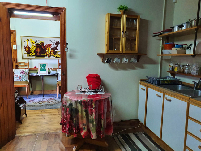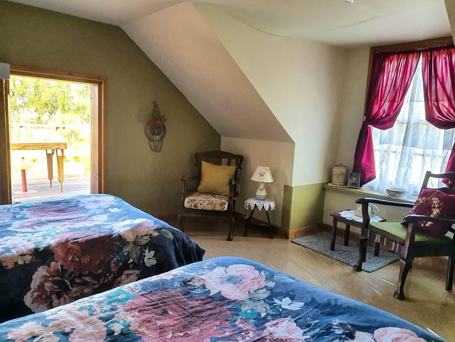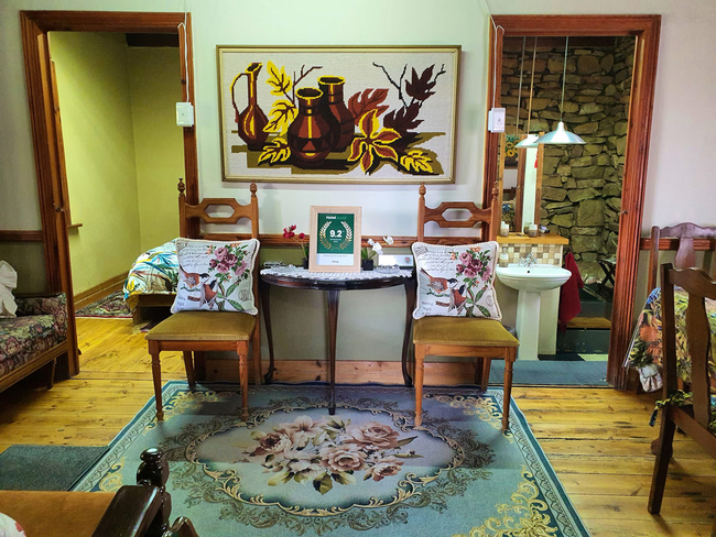 Pansy cottage can accommodate four guests. The main bedroom is furnished with a double bed and there are two single beds in the loft area. The rooms share a bathroom fitted with a shower, toilet and basin. The kitchenette has a bar fridge, stove, microwave, and tea / coffee making facilities. There is no TV or Wi-Fi but there is full signal for cellphones / internet. Complimentary bottled water, coffee, tea, milk and sugar are provided.