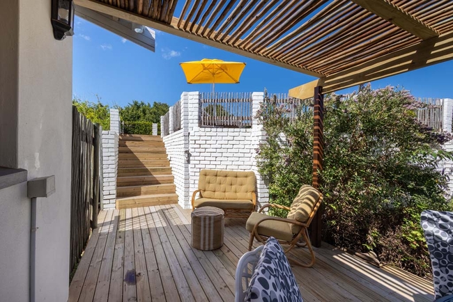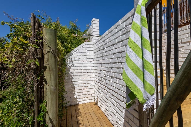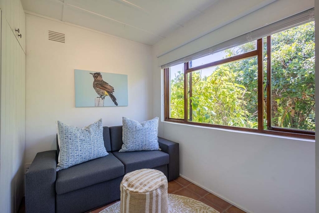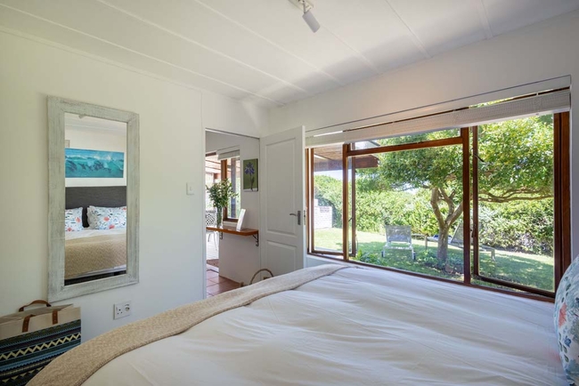 Pansy Shell is a self catering holiday home with four bedrooms and four en-suite bathrooms. Upstairs there are two bedrooms each with a King-size bed and an en-suite bathroom with a shower, bath, basin and a toilet. These rooms lead out onto the balcony. Downstairs there is the third bedroom that has a King-size bed and a bathroom with a bath, shower, toilet and a basin. There is an outside bedroom furnished with a Queen-size bed. The en-suite bathroom is fitted with a shower, toilet and basin. Bed linen, bathroom and beach towels are provided. The open plan living room leads out onto the patio and is furnished with an L-shaped, comfortable couch, coffee table, an indoor fireplace and a flat-screen TV with DStv. The kitchen is fully equipped and contains a double door fridge / freezer, stove, oven, tea / coffee making facilities, microwave, toaster and a breakfast nook with seating. There is a six seater dining table for guests to enjoy their meals. Outside there is an undercover patio with outdoor furniture, a large garden, private swimming pool with sun loungers as well as a net. There is a double garage and two undercover parking bays. The house has an outside laundry and staff toilet. Mandatory housekeeper included in rental contracted to work for tenants 5 days a week [Mon-Fri, excluding public holidays]. Weekends and Public Holidays are on request directly with housekeeper at surcharged rate.