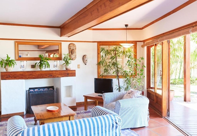 There is a comfortable living area with a TV and a cosy fireplace. There is a separate area with a dining table where you can enjoy your meals.