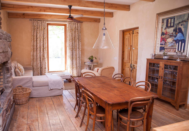 The large kitchen is fully equipped with a gas stove and oven, wood burning stove, microwave, fridge, as well as tea- and coffee-making facilities. Meals can be enjoyed at the breakfast bar or dining table in front of the fireplace. Please note, the house is not fitted with a TV. Wi-Fi access is available. A separate lounge with a fireplace is also available.