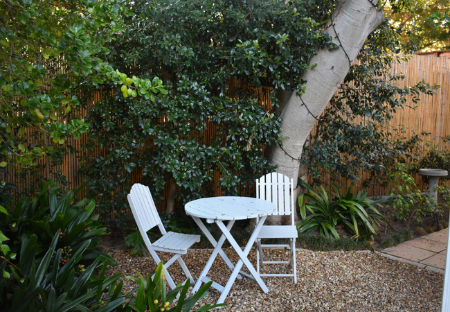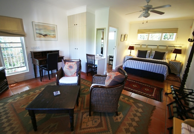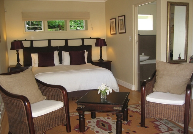 Tastefully furnished with Queen or twin beds, en suite bathroom with bath and separate shower, Led flat screen TV with M-net, shared DSTV, bar fridge, tea tray, hairdryer, overhead fan, safe, under floor heating, electric blankets, desk and seating area. A private exit leading to a courtyard and garden with BBQ facilities. Free access to the internet