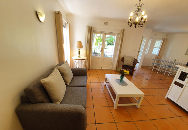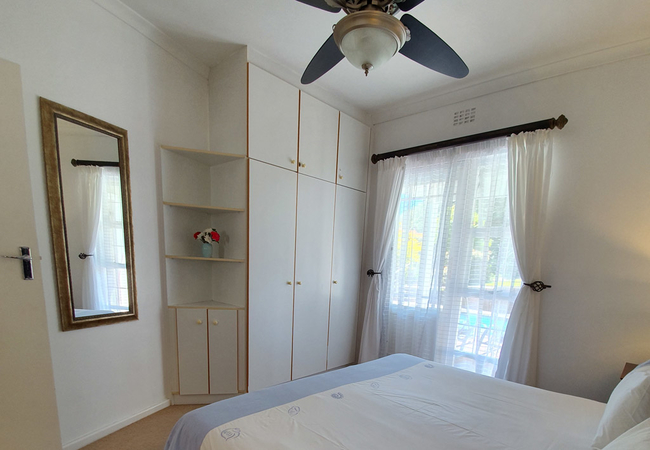 A spacious two bedroom cottage with a fully fitted and equipped kitchen leading on to the dining room, the adjoining lounge, with Led Flat screen TV, Dstv, Dvd, surround sound and a fire place. All rooms have individual access to the pool patio and private garden. Secure garage parking for one car.