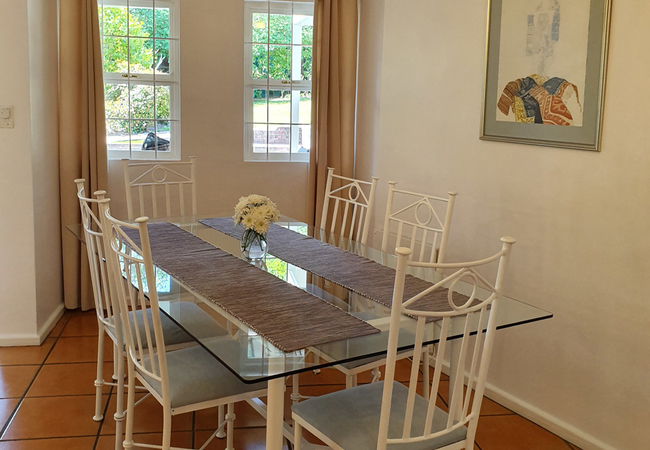 Tastefully furnished with Queen or twin beds, en suite bath and shower, Led flat screen TV, M-Net shared DSTV, fridge, tea tray, safe, hairdryer, winter heating, electric blankets, overhead fans, desk and seating area. A double door opens onto an undercover patio, garden and BBQ area with majestic views of the distant Constantiaberg Mountains, Constantia valley and its wine farms. Free access to the internet