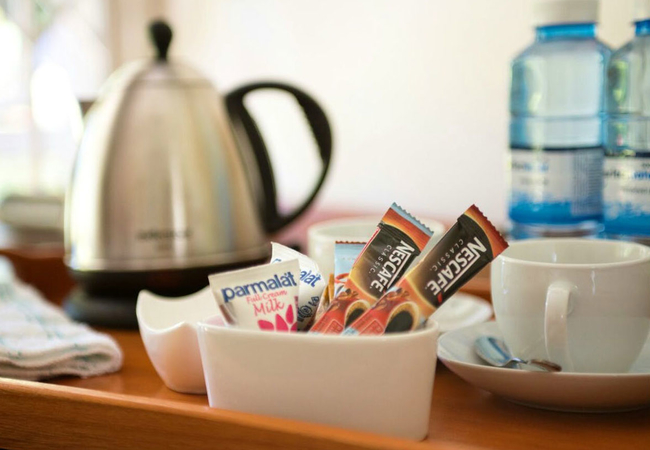 The Twin Room is furnished with two single beds and the en-suite bathroom is equipped with both a bath as well as a stand alone shower or hand held shower in the bath. There is a tea / coffee station and TV with DSTV and we have free Wi-Fi for our guests.