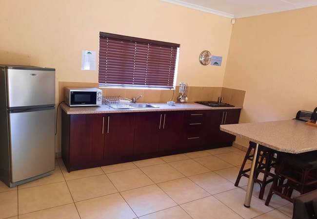The kitchen is fully equipped and includes a fridge, stove, microwave, kettle and a breakfast bar with stools. The lounge is comfortably furnished and has a TV with satellite channels.