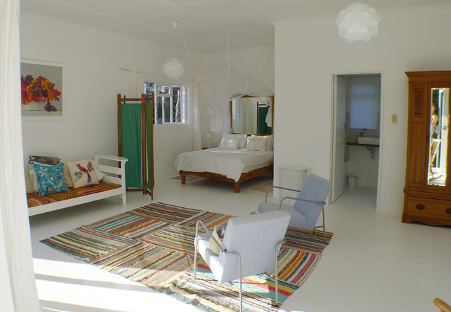 The house is decked with balau wooden decking front and back and creates two separate entertainment areas with mountain and sea views respectively. Outside entertainment area has a table and chairs, long table and benches and a wood fired barbeque. A DVD player and projector provide night time entertainment (there are no regular TV channels and no DStv). Wi-Fi is uncapped.